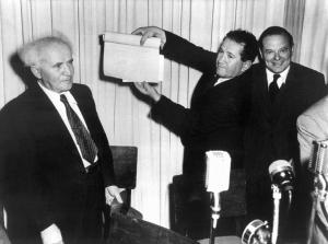 „2000 Jahre haben wir auf diese Stunde gewartet“ so eröffnet David Ben-Gurion in einem kargen, eilig mit sparsamen Aufwendungen von gerade einmal 200 Dollar geschmückten, Saal im Tel Aviver Kunstmuseum am Nachmittag des 14. Mai 1948, Stunden nachdem der letzte Hochkommissar Sir Alan Cunningham das Land verlassen hat, seine Rede. Das weltverändernde Ereignis, das in 33 Minuten über die Bühne geht und mit der Nationalhyne, der „Hatikwa“, endet bringt ihn an das Ziel seiner Träume. Zugleich ist er, wie er selbst sagt, ein „Trauernder unter Feinden“, wissend, dass in diesem Moment die arabischen Nationen das frisch geborene Baby Israel tödlich bedrohen. Daran ändert auch nichts, dass er noch zuvor in der Erklärung der Unabhängigkeit ein Friedensangebot an die Nachbarn gerichtet hat: „Wir bieten allen unseren Nachbarstaaten und ihren Völkern die Hand zum Frieden und guter Nachbarschaft und rufen zur Zusammenarbeit und gegenseitigen Hilfe mit dem selbständigen jüdischen Volk in seiner Heimat auf. Der Staat Israel ist bereit, seinen Beitrag bei gemeinsamen Bemühungen um den Fortschritt des gesamten Nahen Ostens zu leisten.“ Der Kampf um den jungen Staat beginnt noch in der Nacht mit dem unmittelbaren Einmarsch der Heere des Libanons, Syriens, Iraks, Transjordaniens und Ägyptens. Eine Vertreterin des arabischen Hochkomitees für Palästina bringt das zum Ausdruck, was sich wie eine Presserklärung der Hamas anhört: Die Araber stünden zusammen, wie es nie zuvor der Fall gewesen sei, „nicht einmal gegen die Kreuzritter (…) Ein jüdischer Staat hat keine Überlebenschance jetzt, wo der Heilige Krieg ausgerufen wurde. Letztlich werden alle Juden massakriert werden“.