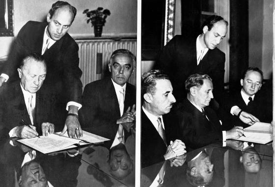 Am frühen Morgen des 10. September 1952 erhielten alle Vertreter der internationalen Presse in Luxemburg einen Anruf: Sie mögen sich bitte bis spätestens viertel vor acht zum Gebäude des Hochkommissariats begeben, wenn sie Zeugen eines historischen Augenblicks werden wollten. Zur genannten Zeit erwartete sie dort mit zwei Fahrzeugen Felix von Eckardt, Chefsprecher des Bundeskanzlers Konrad Adenauer. Die Journalisten stiegen ein, ohne zu wissen, warum man sie herbestellt hatte und wohin man sie bringen wollte. Nach einer kurzen Fahrt erreichten sie das Luxemburger Rathaus. Kanzler Adenauer und der israelische Außenminister Moshe Scharett hatten sich hier zur Unterzeichnung eines Dokuments eingefunden, an dem ihre Verhandlungsteams hart gearbeitet hatten: dem Wiedergutmachungsabkommen.