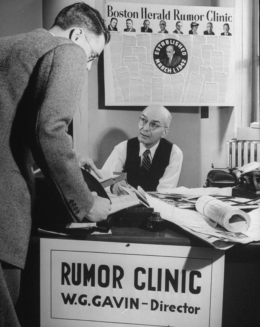 Sozialpsychologisch gestützte Maßnahmen gegen Gerüchte gab es erstmals im Zweiten Weltkrieg in den USA. In Boston richteten Gordon W. Allport, Psychologieprofessor an der Harvard University, und sein Doktorand Robert H. Knapp im März 1942 die erste „rumor-clinic“ ein. Mit Hilfe von Kneipenwirten sammelten die beiden Wissenschaftler und ihr Team die Inhalte des in der Stadt umlaufenden Hörensagens, recherchierten Informationen über die Hintergründe und verfassten seriöse Gegenargumente, die sie gezielt in Umlauf brachten. Das übernahmen ausgewählte Fachleute und Honoratioren: Journalisten und Psychologen, Geistliche, Gewerkschafter, bekannte Geschäftsleute und Polizisten; eine Bostoner Lokalzeitung unterstützte die Arbeit mit einer wöchentlichen Kolumne. Binnen eines Jahres entstanden ähnliche „Gerüchte-Kliniken“ in mehr als vierzig amerikanischen Städten. Es war der Beginn der systematischen Forschung über Falschnachrichten.[13]
