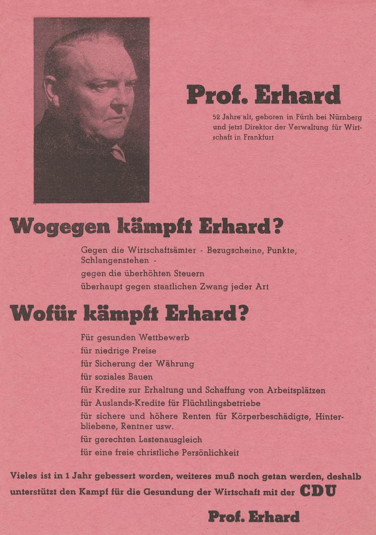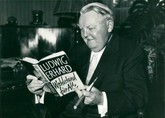 Seine Person lädt zur Etablierung einer Art heroischen Mythos in der Tat nicht ein. Erhard, Sohn einer kleinbürgerlichen Händlerfamilie aus dem fränkischen Fürth, im Ersten Weltkrieg schwer verwundet und seither gesundheitlich beeinträchtigt, sodass eine Übernahme des elterlichen Geschäfts dauerhaft nicht in Frage kam, absolvierte in den 1920er Jahren erst eine Ausbildung zum Diplom-Kaufmann an der Handelshochschule Nürnberg und dann ein Wirtschaftsstudium an der Universität Frankfurt am Main, das er mit der Promotion bei Franz Oppenheimer abschloss. Der Sprung in eine akademische Karriere, den er beabsichtigte, gelang ihm danach nicht. Stattdessen übernahm er für drei Jahre das väterliche Geschäft, konnte aber dessen Konkurs nicht verhindern. Schließlich fand er in Wilhelm Vershofens Institut zur Wirtschaftsbeobachtung der deutschen Fertigware an der Nürnberger Handelshochschule, einem Vorläufer der späteren Gesellschaft für Konsumforschung, eine Stelle als Referent, die er bis 1942 ausübte, bevor er das Haus im Streit um die Nachfolge Vershofens verlassen musste. Mit Mitteln der Reichsgruppe Industrie betrieb Erhard danach das „Institut für Industrieforschung“, in dessen Rahmen er umfangreiche Studien zur Umstellung der Wirtschaft nach dem Krieg anstellte. Während hier schließlich eine umfängliche Denkschrift entstand, kamen in den 1930er Jahren betriebene Pläne für eine Habilitation nicht über das Anfangsstadium hinaus. Gleichzeitig hatte Erhard sich publizistisch im Sinne der Fertigwaren- bzw. genauer der Konsumgüterindustrie geäußert und später auch „Forschungsaufträge“ zur Behandlung der Wirtschaft in Österreich und den besetzten Gebieten, unter anderem zu Polen, übernommen. Das Kriegsende erlebte Erhard in Bayreuth, wohin sein Institut seinen Sitz verlegt hatte. Nach einer Zwischentätigkeit als Wirtschaftsreferent der Fürther Kommunalverwaltung wurde er im Oktober 1945 bayerischer Staatsminister für Handel und Gewerbe im Kabinett Hoegner, eine Stellung, die er bis zu den Wahlen im Herbst 1946 behaupten konnte. Danach übernahm er 1947 die Leitung der mit der Vorbereitung einer Währungsreform befassten Bad Homburger Sonderstelle „Geld und Kredit“. Im März 1948 wurde Erhard schließlich auf liberale Initiative hin Direktor der bizonalen Verwaltung für Wirtschaft, ein Amt, das es ihm ermöglichen sollte, auf die wirtschaftspolitischen Weichenstellungen nach der Währungsreform im Sommer 1948 entscheidenden Einfluss zu nehmen.