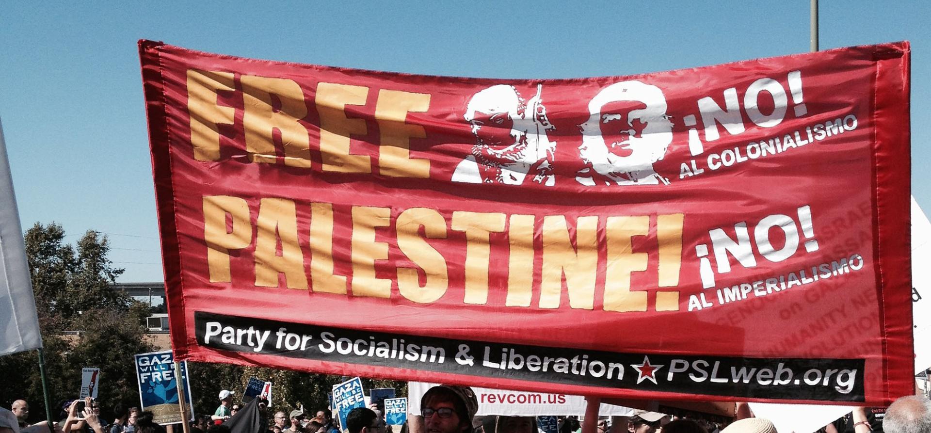 Demonstrationsplakat eines „Block the Boat“-Protests, auf dem Israel Kolonialismus und Imperialismus vorgeworfen wird, Oakland, Kalifornien, 16. August 2014. Alex Chis / flickr / CC BY-SA 2.0 / creativecommons.org/licenses/by-sa/2.0/deed.de