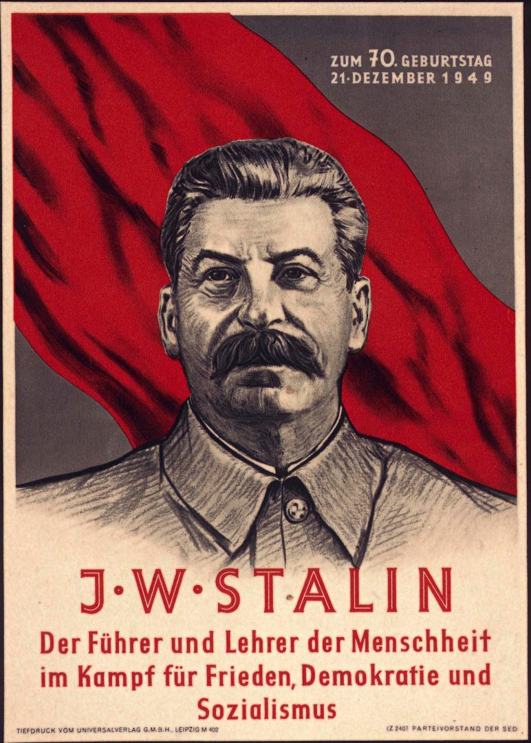 Stalinistisches Propagandaplakat von 1949. Die kommunistische Geschichtsschreibung stellte ihr eigenes System als erfolgreiches Modell dar und betonte vermeintliche Errungenschaften. Verbrechen, Zwangskollektivierung, Gulag-System oder die Verfolgung politischer Gegner fanden nicht oder nur minimal Eingang ins offizielle Geschichtsbild. Bundesarchiv Plak 102-070-029