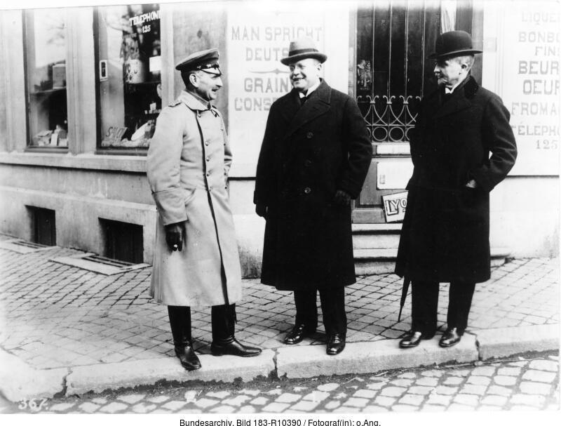 Erst das Kabinett Max von Badens, das angesichts der militärischen Niederlage des Deutschen Reiches im Oktober 1918 gebildet wurde und dem Erzberger als Minister[3] angehörte, setzte Verfassungsänderungen und den Primat der Politik gegenüber dem Militär durch. Doch bevor das Kaiserreich zu einer parlamentarischen Monarchie umgewandelt wurde, brach es in der Revolution von 1918 zusammen. Am 11. November 1918, zwei Tage nach der Ausrufung der Republik, unterzeichnete Erzberger in Nordfrankreich den Waffenstillstand und beendete damit für Deutschland den Ersten Weltkrieg.