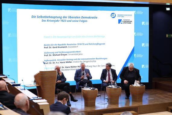 Den Folgen des Ersten Weltkriegs, den Bürden für die junge Republik, widmete sich das erste Konferenzpanel. Für Michael Dreyer, der in seinem Input auf die Verfassungswirklichkeit einging, waren „die konkreten Krisen […] ein Ausdruck der Strukturkrisen“. Die Republik habe das Trauma des Krieges nicht heilen können, denn „Weimar war ein Kind des Krieges“, wie es Gerd Krumeich in seiner Analyse der Nachkriegsbürden treffend formulierte. Auch die Entwicklung der internationalen Beziehungen, auf die Horst Möller umfassend einging, wirkte destabilisierend, schließlich konnten die Siegerstaaten keine stabile Nachkriegsordnung herstellen.