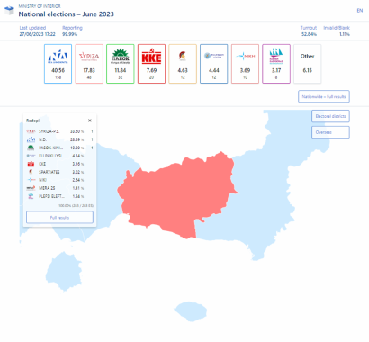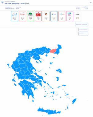 Am 25. Juni 2023 errang Kyriakos Mitsotakis mit seiner NEA DIMOKRATIA (ND) einen klaren Sieg über die Partei SYRIZA von Alexis Tsipras. Mit 40,6% der Stimmen stellt sie künftig 158 von 300 Abgeordneten im griechischen Parlament. Demgegenüber kam SYRIZA auf 17,8% und 48 Sitze. Der Unterschied von fast 23 Prozentpunkten ist damit dreimal so groß wie der Unterschied bei den Wahlen 2019. In dieser Tatsache manifestiert sich nicht nur die politische Dominanz der ND, sondern auch eine strategische Niederlage für SYRIZA. Außerdem ist es ein seltenes Phänomen in der griechischen Politik, dass eine regierende Partei ihren Anteil nach einer ersten Amtszeit erhöhen kann (ein ähnliches Ergebnis wurde seit 1974 nicht mehr erreicht).