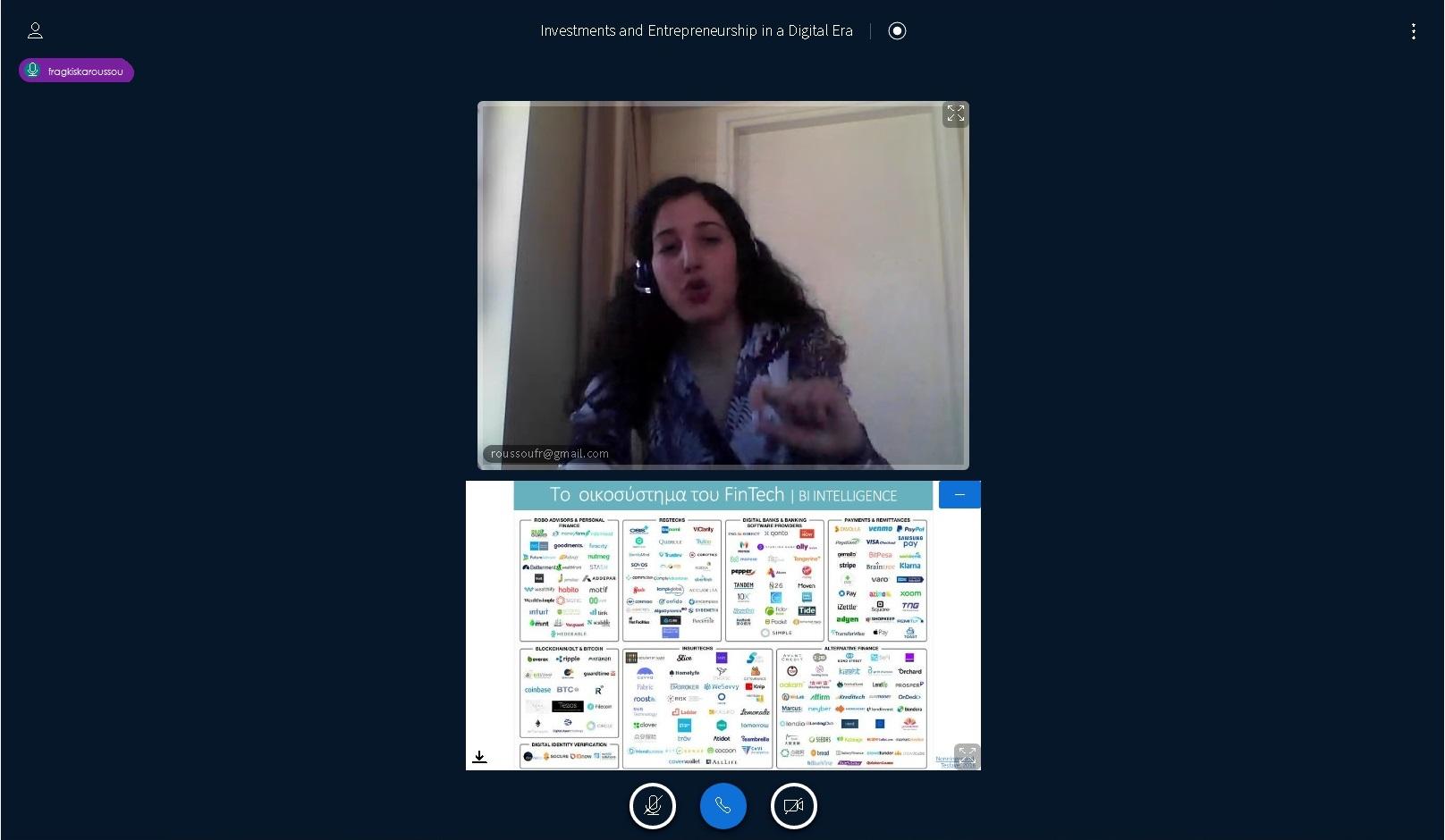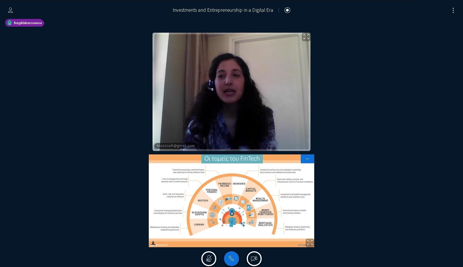 Jessica Roussou, Digital Product Risk Analyst at HSBC Digital in London took over in the second part of the event. She presented an overview on contemporary banking, talking in broad strokes from traditional banking to fintech and digitalization, and in specific on "Challenger banks", which are cloud native and digital-only. In the second part of her presentation she focused on the Fintech landscape in London and the ecocystem around banks and digital banks, stressing out the need for human judgement against automation.