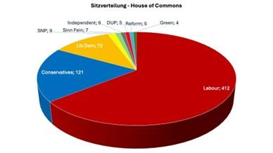 Auch wenn sich dieses Wahlergebnis tendenziell seit langem abzeichnete, sprachen die konkreten Ergebnisse noch einmal für sich und sorgten zum Teil auch für Überraschungen. Bei einer historisch niedrigen Wahlbeteiligung von 60% (vgl. 2019 67%) konnte Labour sich 412 Sitze im Unterhaus sichern (vgl. 2019: 203). Das ist nahezu das gleiche Sitzergebnis, dass Tony Blair beim letzten fulminanten Labour-Sieg in 1997 einfahren konnte (418 Sitze). Im neuen Parlament stellt Labour mit einer überwältigenden 174-Sitze-Mehrheit die neue Regierung. Diese Mehrheit besagt, dass Labour 174 Sitze mehr auf sich vereinen konnte als alle anderen Parteien zusammengerechnet. Gleichwohl musste Labour schmerzliche Einbußen und auch Sitzverluste hinnehmen in Wahlkreisen mit einem hohen muslimischen Bevölkerungsanteil. Hier gewannen vor allem unabhängige Kandidaten, die kritisch zu den Solidaritätsbekundungen Keir Starmers gegenüber Israel standen. Auch der ehemalige Labour-Führer Jeremy Corbyn konnte sich in seinem Wahlkreis im Norden Londons als Unabhängiger gegenüber dem Labour-Kandidaten durchsetzen und zog in das Unterhaus ein.
