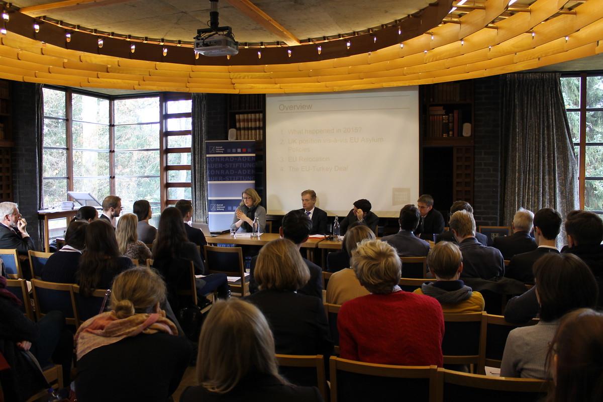 Schließlich wurden die Implikationen des Brexit für die Migration und die europäischen Antworten auf die Flüchtlingskrise diskutiert. Eine besondere Rolle spielte nicht nur der Europäische Grenzschutz, sondern auch die politischen Folgen im Rahmen eines Erstarkens rechtspopulistischer Parteien in Europa. Der deutsche Botschafter im Vereinigten Königreich Dr. Peter Ammon stellte hierzu die bisherigen politischen Handlungen Deutschlands und die Positionen in Hinblick auf zukünftige europäische Kooperation dar. Prof. Cathryn Costello vom Refugee Studies Centre der University of Oxford gab einen umfassenden Überblick über die Entwicklungen der Flüchtlingsbewegungen in den Vergangenen Jahren insbesondere als Folge des Bürgerkrieges in Syrien. Dr. Ruben Andersson von der University of Oxford analysierte insbesondere den Umgang mit diesen Herausforderungen in Europa und die zu erwartenden Auswirkungen des Brexit.
