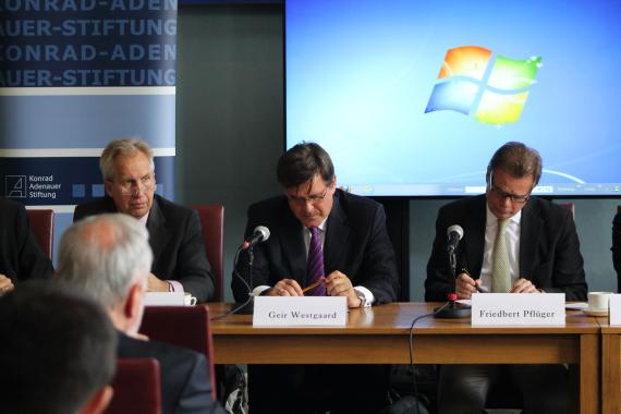 From left to right:Hans-Hartwig Blomeier, Director, KAS UK & IrelandGeir Westgaard, Vice President, Political Analysis, Global Strategy and Business Development, StatoilProfessor Dr Friedbert Pflüger, Director, EUCERS, King's College London