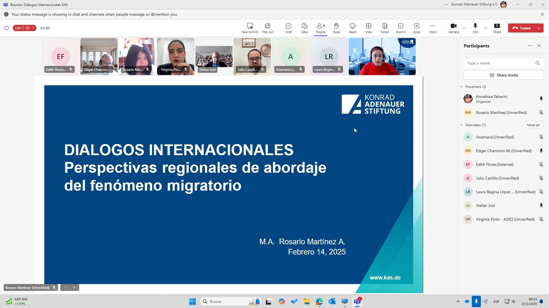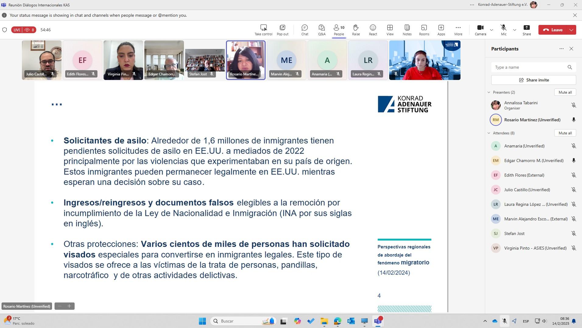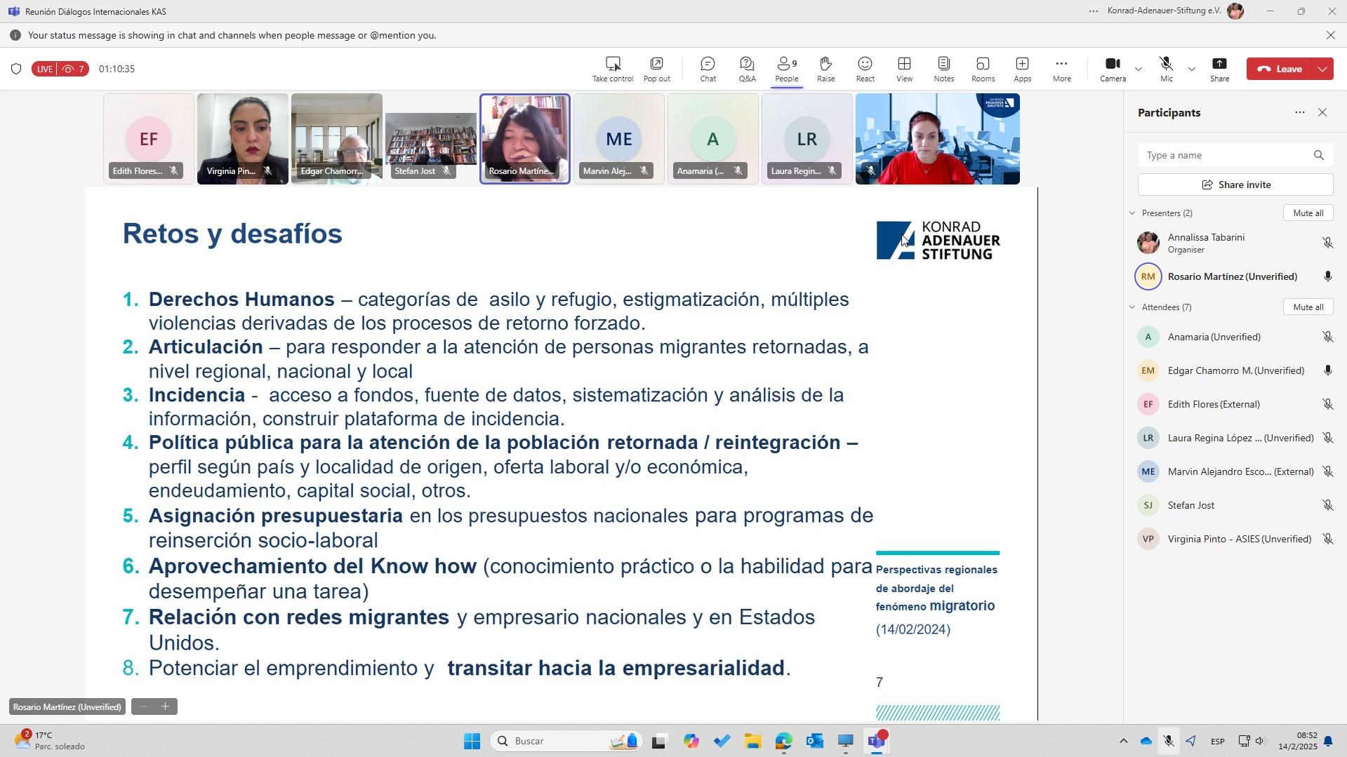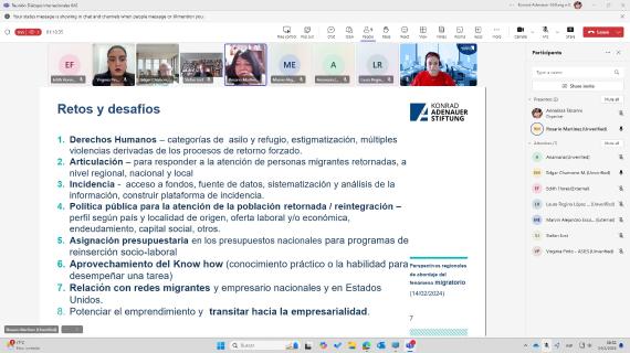 Im Anschluss an die "Internationalen Dialoge der KAS" wird der Sitzungszyklus 2025 mit dem virtuellen Treffen #1 unter dem Motto "Regionale Perspektiven auf den Umgang mit dem Migrationsphänomen" eröffnet, das von der Expertin Rosario Martínez gehalten wird.