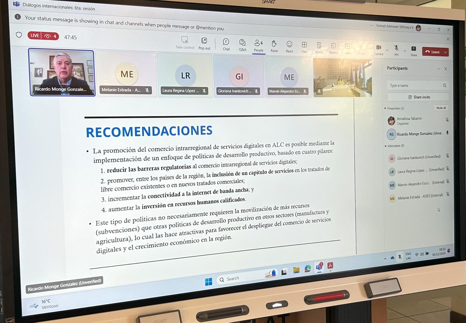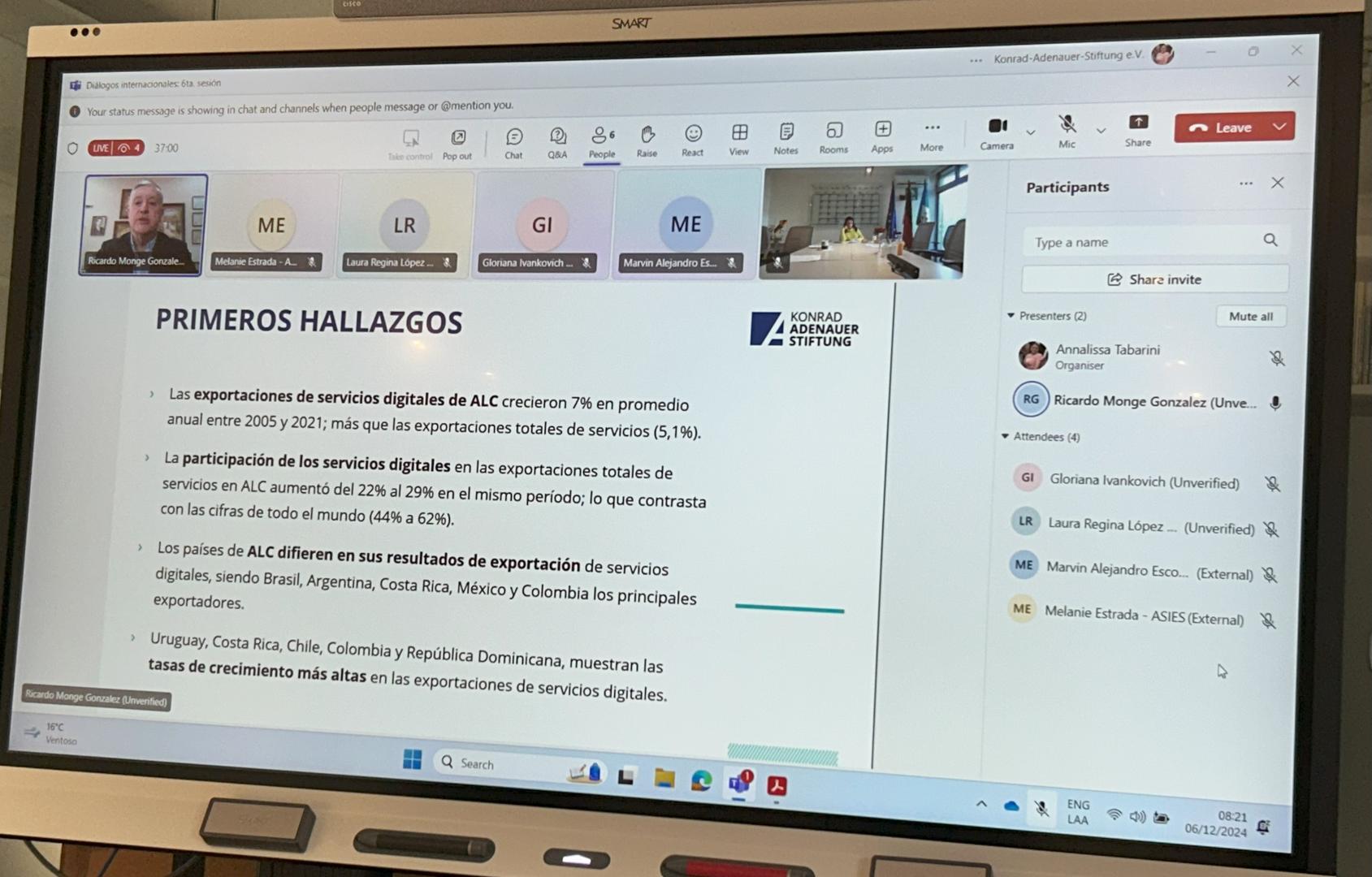 Am Freitag, den 06.12.2024, findet im Anschluss an die Internationalen Gespräche der KAS der 6. KAS Internationaler Dialog mit der Dissertation von Dr. Ricardo Monge, Präsident der Akademie von Zentralamerika zum Thema: "Digitale Dienstleistungen als neuer Motor der regionalen Integration und des Wachstums in Lateinamerika und der Karibik (LAK)", in der er seine Vision, Position und unter den Zielen der Studie teilt, können wir erwähnen: