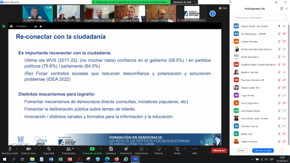 Die Vertreter der Wahlinstitute und/oder -schulen Lateinamerikas und der Karibik wurden zu dieser Veranstaltung eingeladen, um einen Dialog zu führen und sich zu verpflichten, Informationen und Arbeitsideen auf der Ebene der einzelnen Länder, Subregionen und der lateinamerikanischen Region im Allgemeinen auszutauschen.