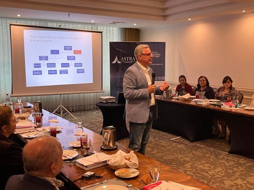 Las palabras de bienvenida fueron dirigidas por el Dr. Nicholas Virzi, Director del Instituto de Liderazgo y Gobernanza Astra de la Fundación Industrial, Guatemala, y por Virginia Barrios, coordinadora de proyectos de la KAS Guatemala. La conferencia fue impartida por el Dr. Marcus Marktanner, conferencista invitado por la Fundación Konrad Adenauer, doctor en economía y experto en ESM. El conferencista presentó los principios básicos de la ESM, y explicó cómo la política industrial de Alemania se ha enmarcado en dichos principios. Posterior a eso, los participantes pudieron hacerle consultas, principalmente relacionadas a la implementación de los principios en Guatemala, y de cómo poder seguir impulsando el desarrollo industrial en el país.