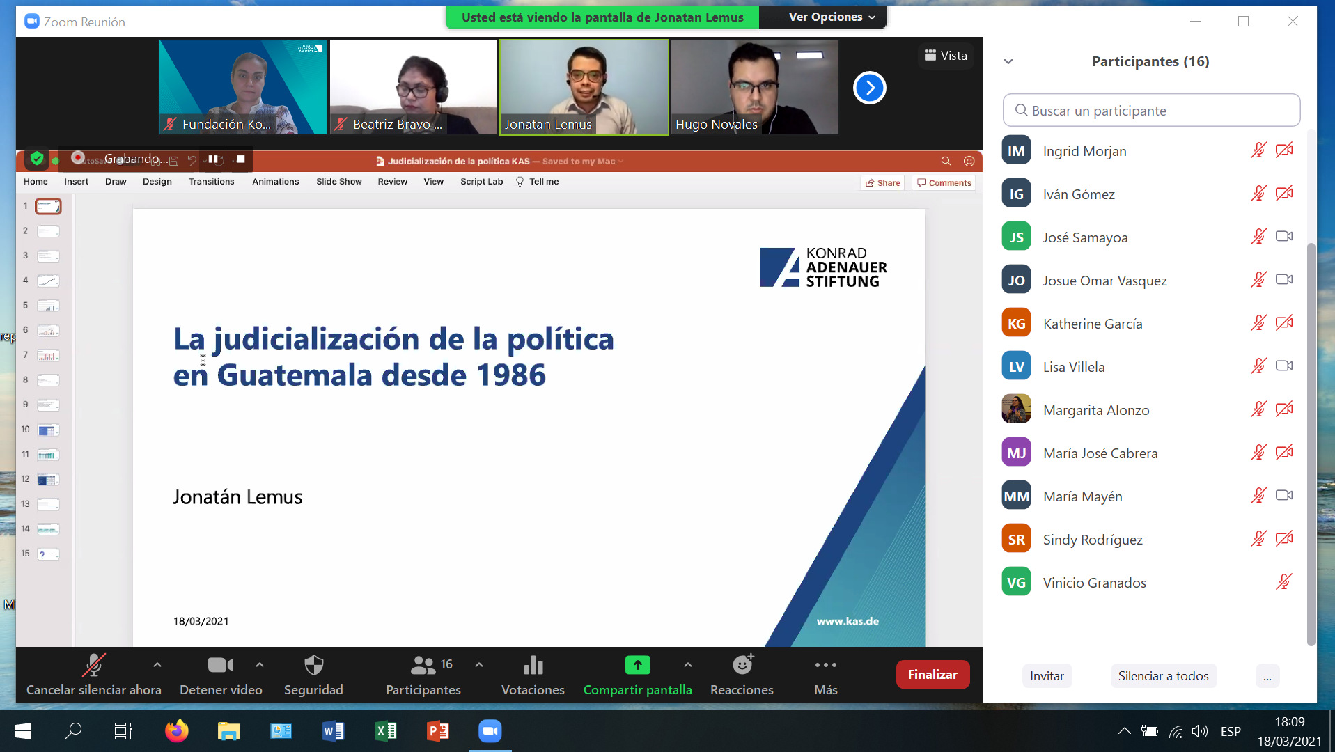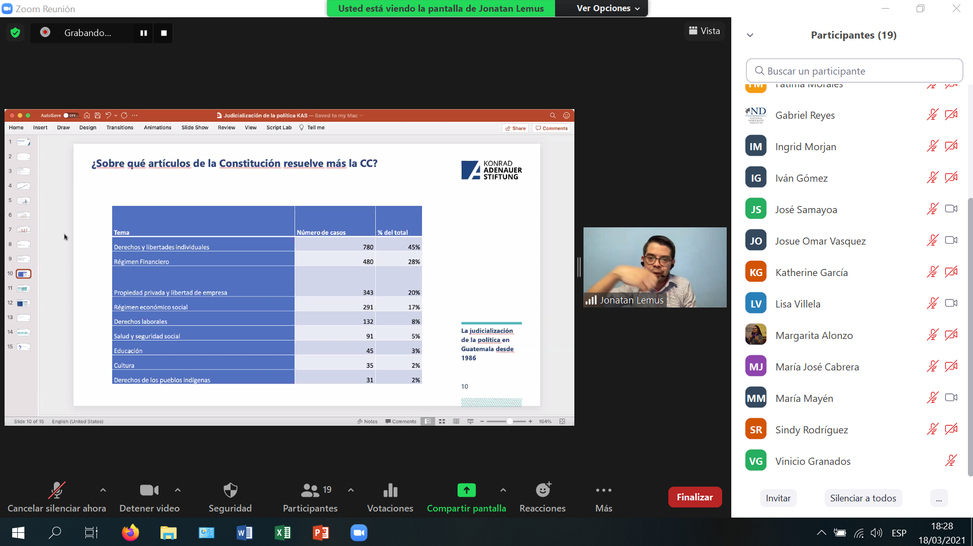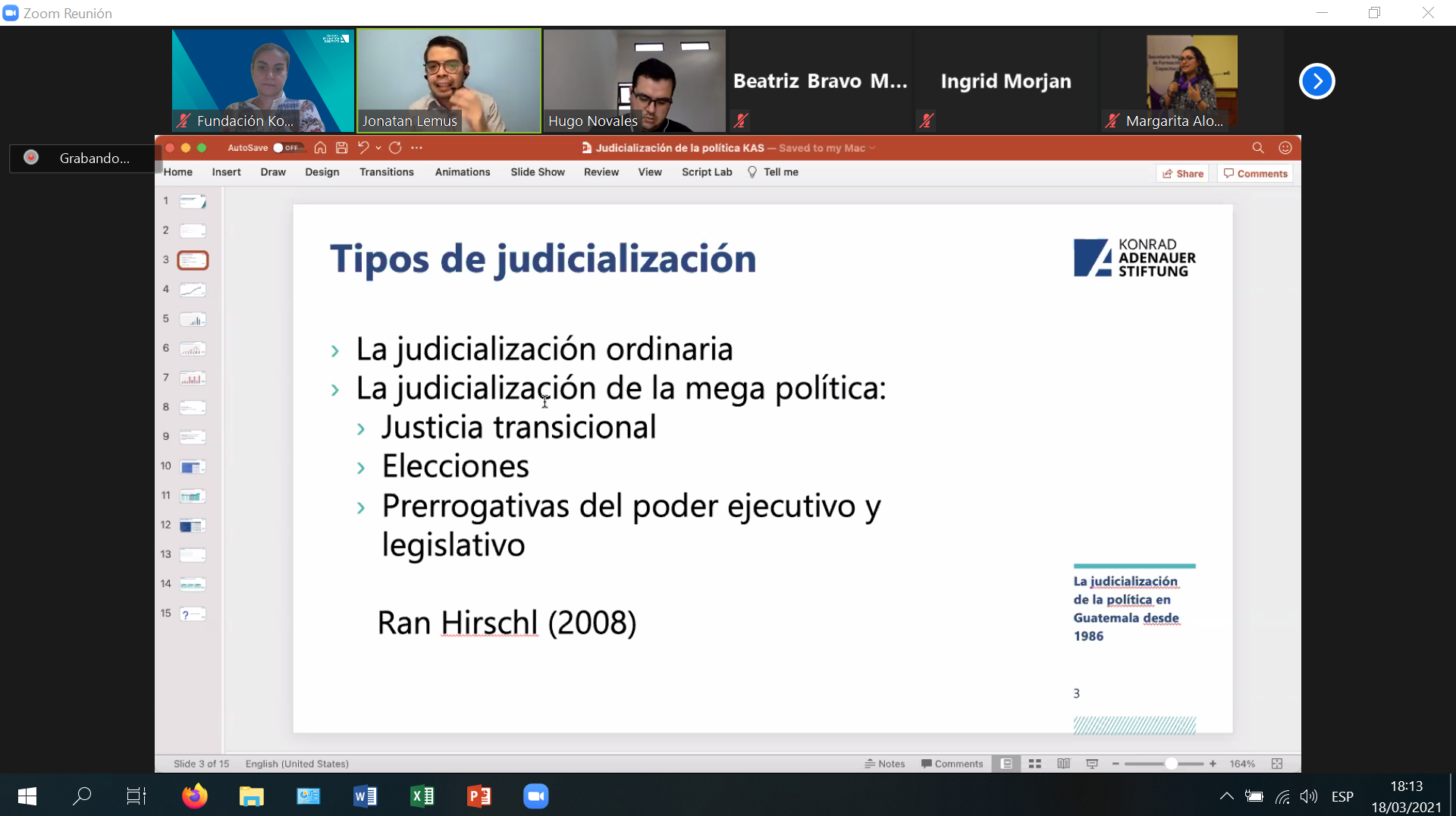 Am Donnerstag, dem 18. März 2021, hielt der Politikwissenschaftler Jonatan Lemus, im Rahmen des ersten Treffens 2021 der Stipendiatinnen und Stipendiaten der KAS Guatemala einen Vortrag zum Thema: "Die Verrechtlichung der Politik".