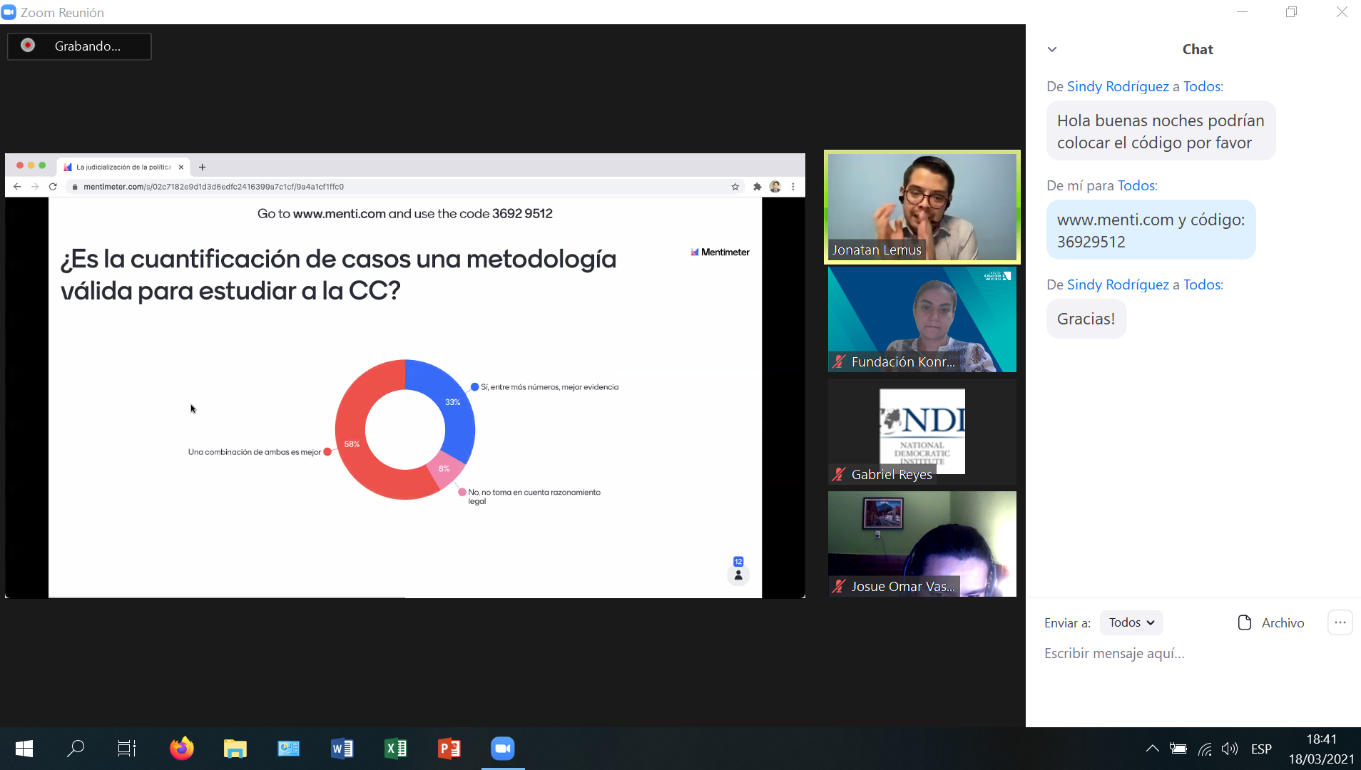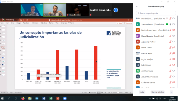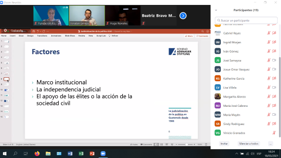 Der Politikwissenschaftler Jonatan Lemus, diskutierte mit dem Netzwerk der Stipendiatinnen und Stipendiaten der KAS Guatemala das Thema der Verrechtlichung der Politik.