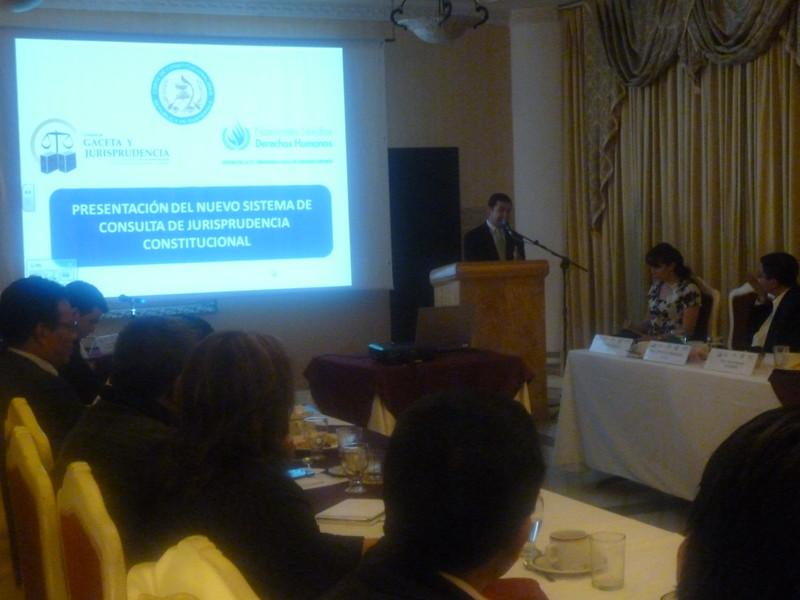 - Presentación del Sistema de Consulta Electrónica de Jurisprudencia Constitucional a cargo del Lic. Juan Ignacio Gálvez Quiñónez, Jefe de Gaceta y Jurisprudencia de la Corte de Constitucionalidad, invitando a utilizar la herramienta para apoyar su labor de argumentación jurídica, dado la facilidad que ofrece este sistema para hacer búsquedas a través de las distintas opciones que se ofrecen y adicionalmente ofrece un catálogo que clasifica los derechos humanos, lo cual ha sido una innovación en la cual apoyó la OACNUDH.