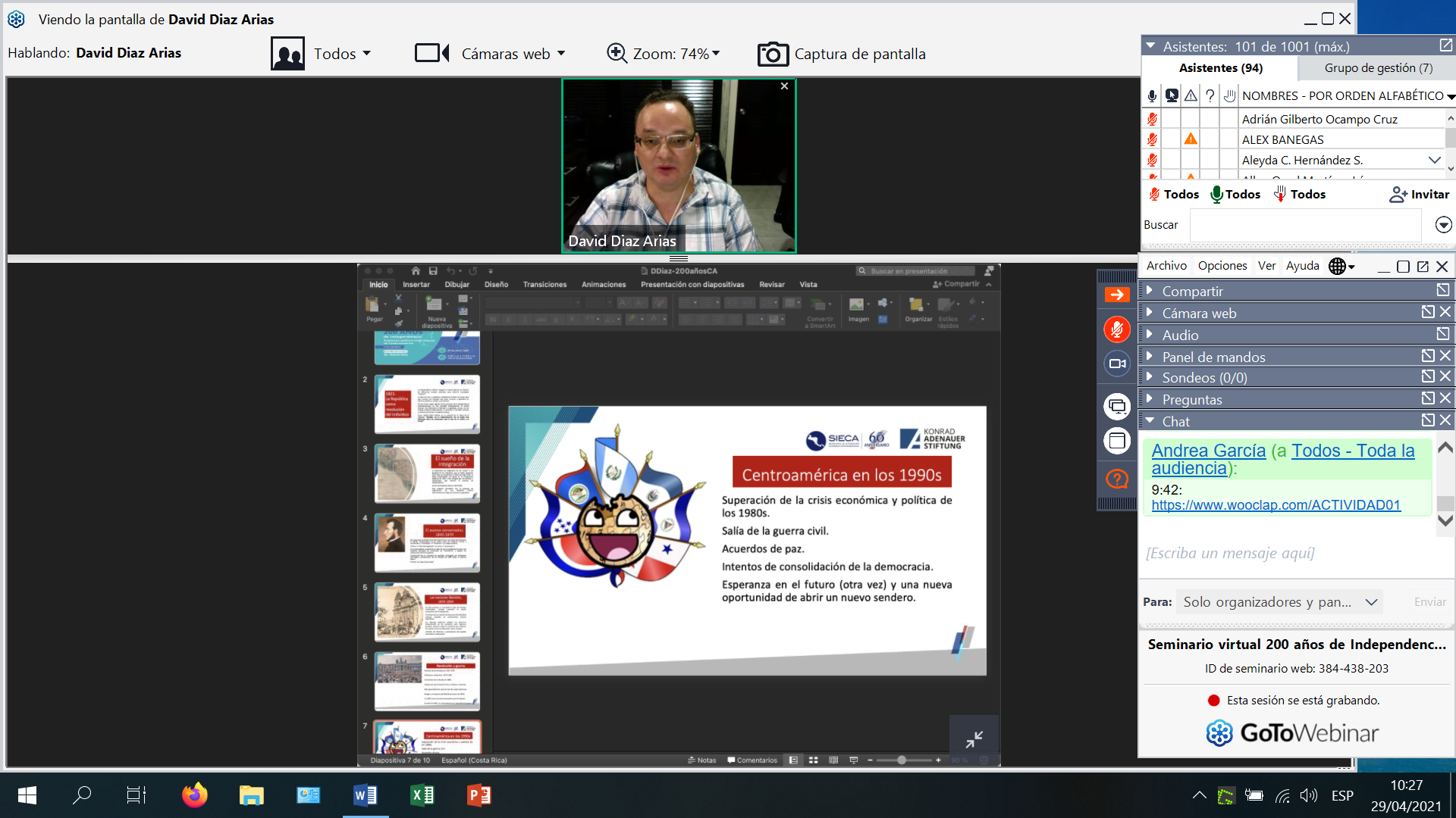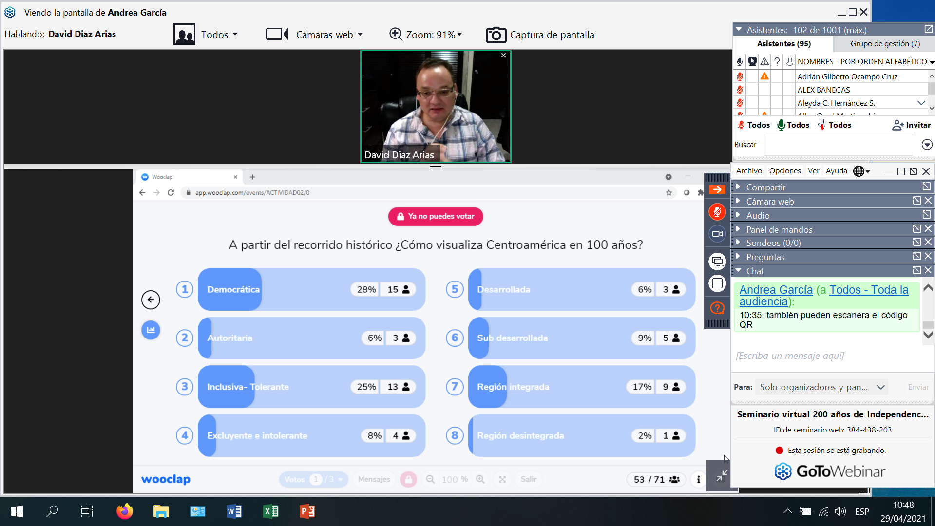 Mit Hilfe der Wooclap Plattform konnten die Teilnehmer sich über ihre Nationalität, ihre Ideen zur Zweihundertjahrfeier und die Zukunft Zentralamerikas austauschen.