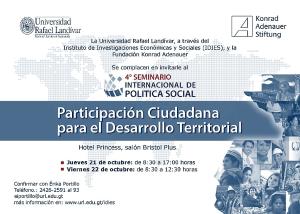 Con el propósito de promover la participación ciudadana en la gestión de las políticas públicas y en el marco de la Economía Social de Mercado, desde el año 2007 se lleva a cabo el Seminario Internacional de Política Social con el apoyo del Instituto de Investigaciones Económicas y Sociales –IDIES- de la Universidad Rafael Landívar –URL-, y que en esta ocasión se tituló “Participación Ciudadana para el Desarrollo Territorial”.