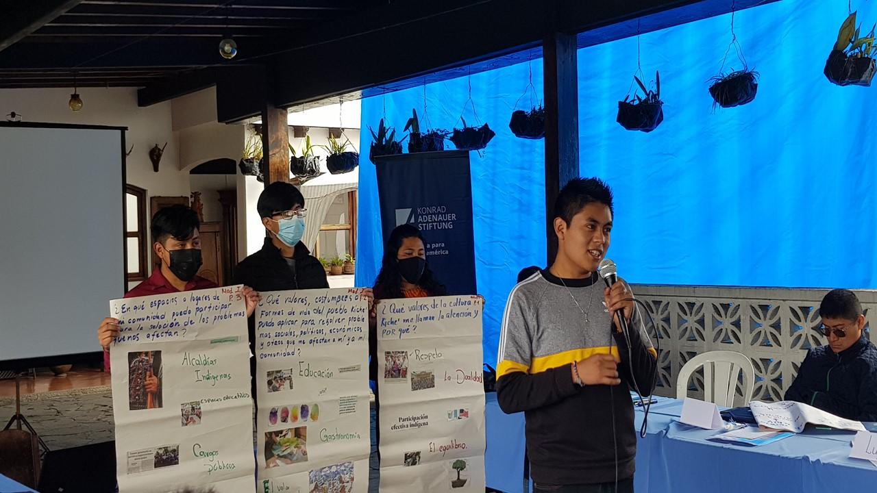 An der Veranstaltung nahmen 21 Jugendliche teil. Die Dynamik und die Arbeitsgruppen wurden von Gilda Paulina Menchú Tzun geleitet, einer jungen Maya K'iche', deren Erfahrung es den Teilnehmern ermöglichte, sich zu integrieren und in Gruppen zu arbeiten, um ihre Meinung zu äußern, bevor der Lehrer ihre Präsentationen hielt.
