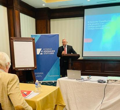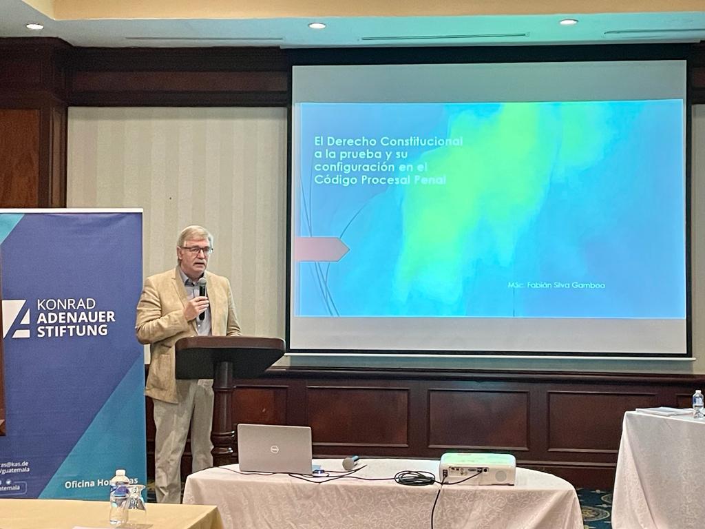 Der Vortrag wurde von Dr. Fabián Silva (Costa Rica) gehalten, der u.a. die theoretischen und verfassungsrechtlichen Grundlagen des Rechts auf Beweismittel und die Beiträge des Interamerikanischen Menschenrechtssystems im Strafprozesssystem darlegte.