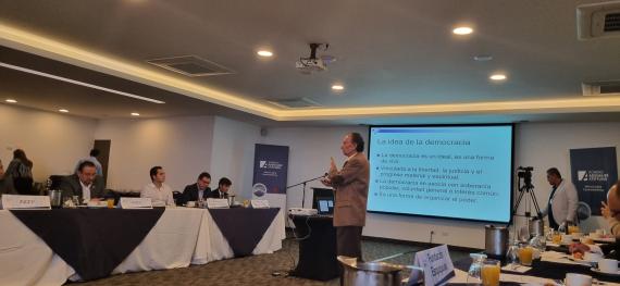 Miguel Ángel Balcárcel, der insbesondere auf das Konzept der interkulturellen Demokratie hinwies, das auf der Anerkennung, der Achtung und der Förderung der kulturellen, ethnischen und sprachlichen Vielfalt beruht, mit dem Ziel, das soziale und politische Zusammenleben auf der Grundlage der Werte, des Wissens und der Problemlösungsmethoden, die jedes Volk und jede Kultur mitbringt, in einem bürgerlichen und politischen Engagement für die nationale Einheit zu stärken.