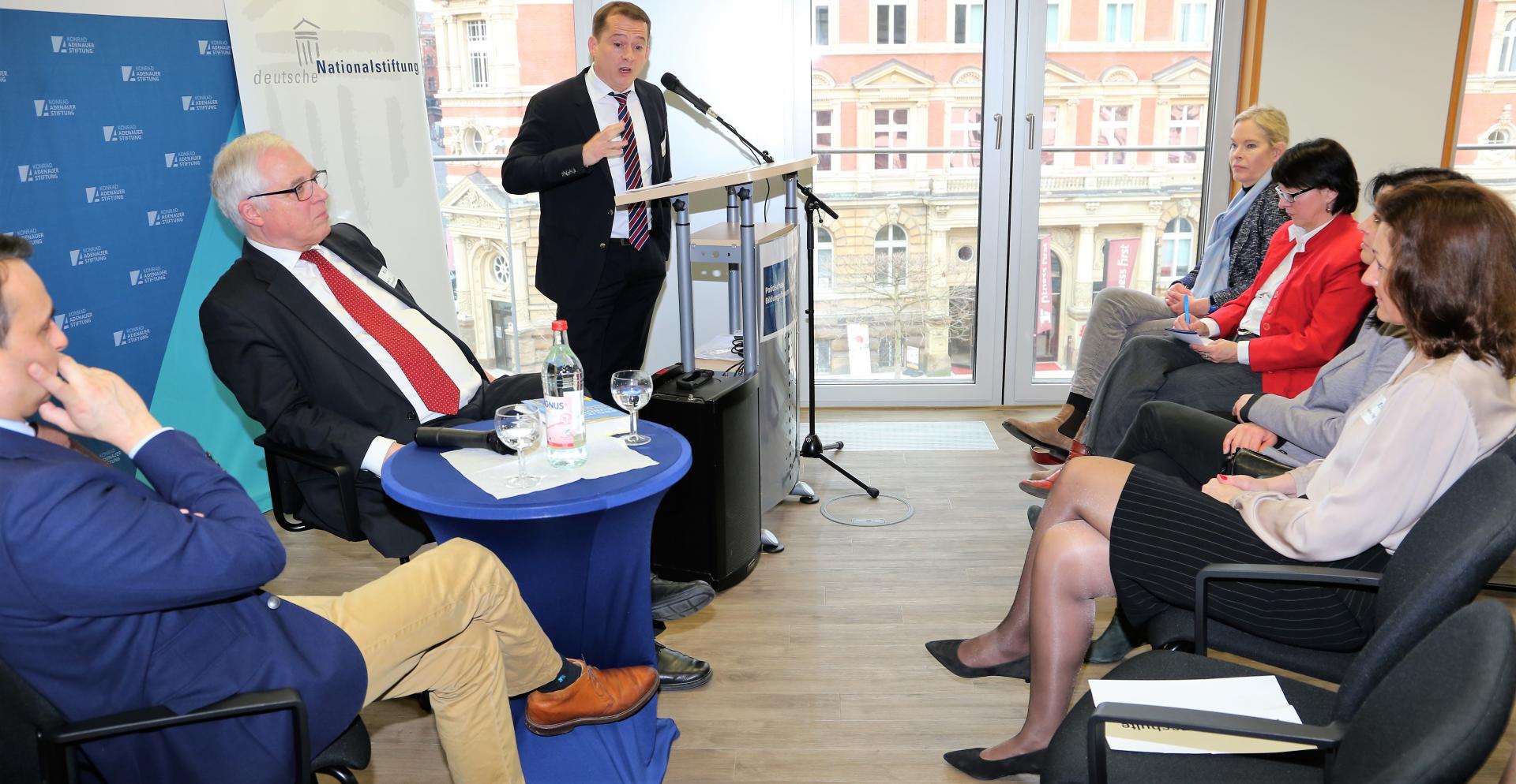 "Die Idee der Nation und die Bestimmung unserer nationalen Identität in einem geeinten Europa dürfen wir weder extremen politischen Kräften noch den Gegnern der europäischen Integration überlassen": Dieser Satz Helmut Schmidts schwang bei der Europa-Matinee der Konrad-Adenauer-Stiftung Hamburg mit. Der verstorbene Nachfolger des ersten Regierungschefs, war neben anderen Hamburgern wie Versandhaus-Manager Michael Otto und Verleger Gerd Bucerius Gründer der Deutschen Nationalstiftung. Ihr Vorstand Prof. Dr. Eckart Stratenschulte stellte die Hauptredner am 9. Februar vor: "Professor Dr. Kiran Klaus Patel hat das Buch und das Motto unseren 70 Gästen mitgebracht: 'Projekt Europa, eine kritische Geschichte.' Hamburgs CDU-Chef, Dr. Roland Heintze, will sich im Europaparlament für Hamburg einsetzen".