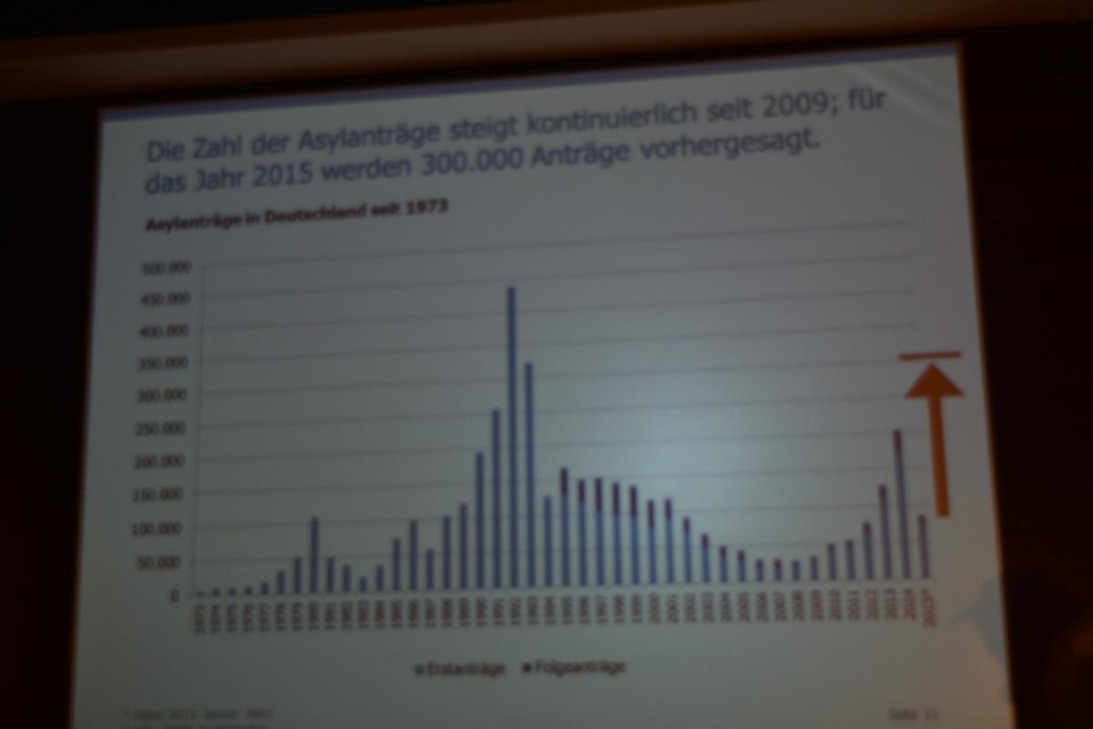 In Hinblick auf die aktuelle Situation kann man wenig über die ankommenden Bürger sagen. Beruf, Ausbildung und Lebensstandard im Heimatland konnten noch nicht erfasst werden. Lediglich Alter, Geschlecht und Herkunft sind sicher nachzuweisen. Hierzu erläuterte Dr. Holger Kolb, warum der Anteil an jungen Männern im Vergleich zu den Frauen so dominiert. Die Männer werden vorgeschickt, um bei einer sicheren Ankunft dann ihre Familien später nachzuholen. Auch dies ist ein Grund, welcher aktuelle Prognosen zur Zahl der Asylsuchenden nahezu unmöglich macht: keiner kann sagen, wie viele Familiennachzüge es noch geben wird.