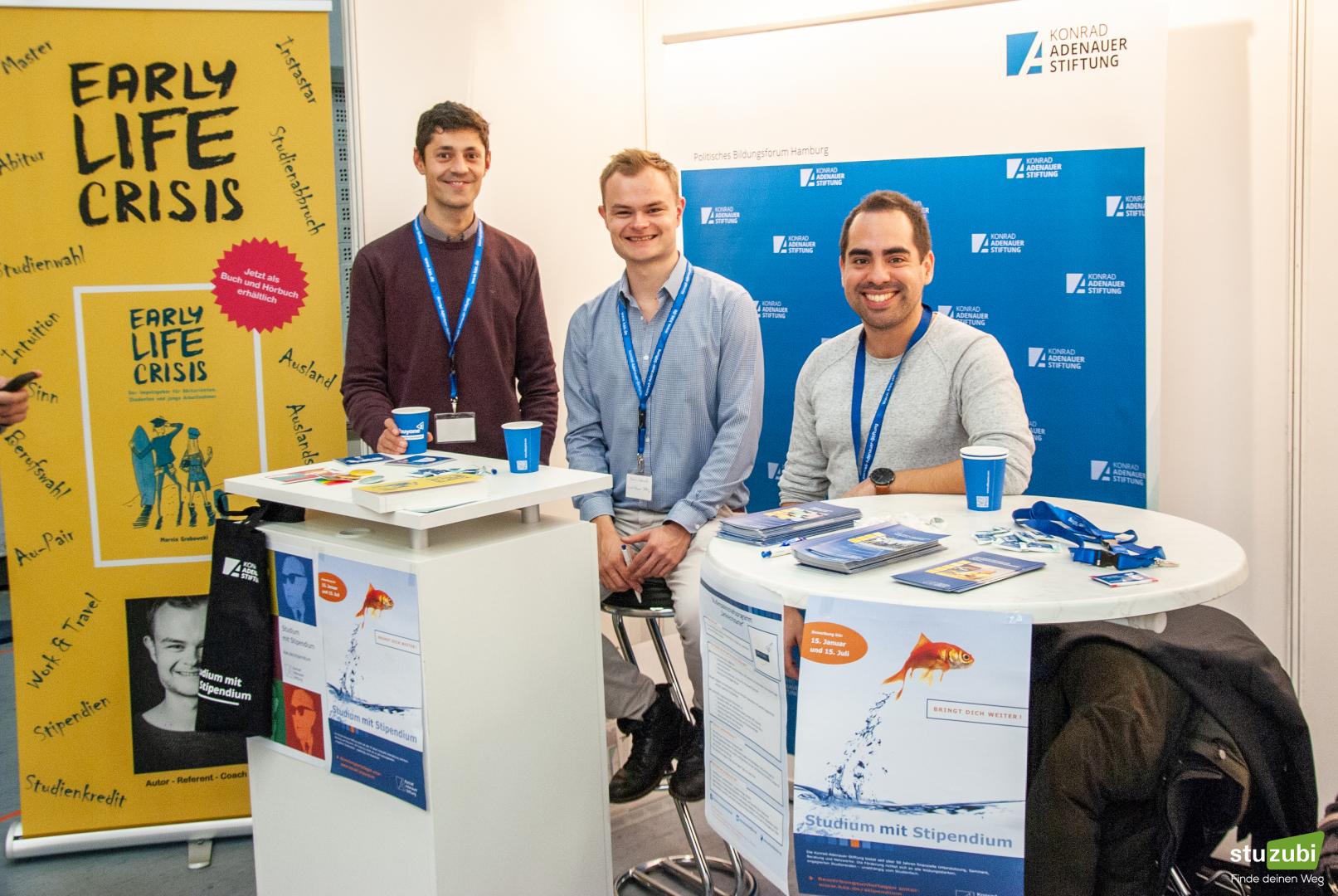 Über 100 verschiedene Hochschulen, Unternehmen und öffentliche Institutionen waren auf der „Stuzubi“ vertreten und zeigten auf, wie es nach der Schule weitergehen kann. Zum ersten Mal war auch das Politische Bildungsforum Hamburg der Konrad-Adenauer-Stiftung e.V. (KAS) mit einem jungen Team vor Ort. Die Besucherinnen und Besucher schenkten der KAS, als eine der wenigen Institutionen auf dieser Messe, die Stipendien und weitere Studienfördermöglichkeiten anbietet, besonders viel Aufmerksamkeit.