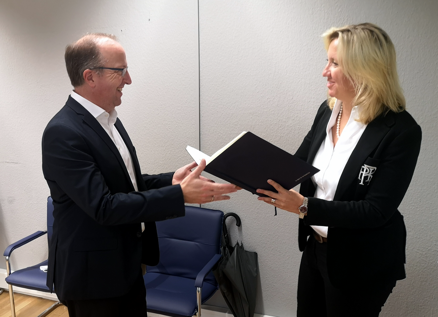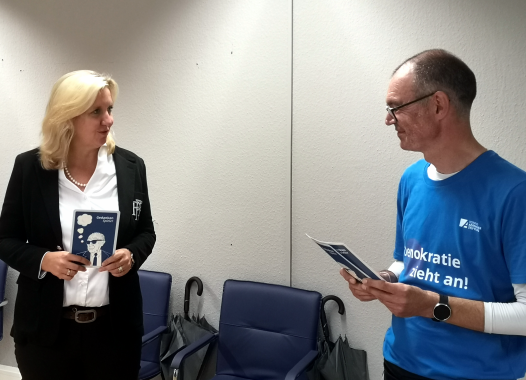 Ines Claus übergibt Ingo Schon das Buch für die Demokratie. Ingo Schon, Stadtverordnetenvorsteher in Eltville am Rhein, schreibt: "Demokratie muss jeden Tag verteidigt werden - überall und von jedem einzelnen. In Weißrussland, Europa, Deutschland, im Freundeskreis und zu Hause. Jeder trägt Verantwortung - jeden Tag."