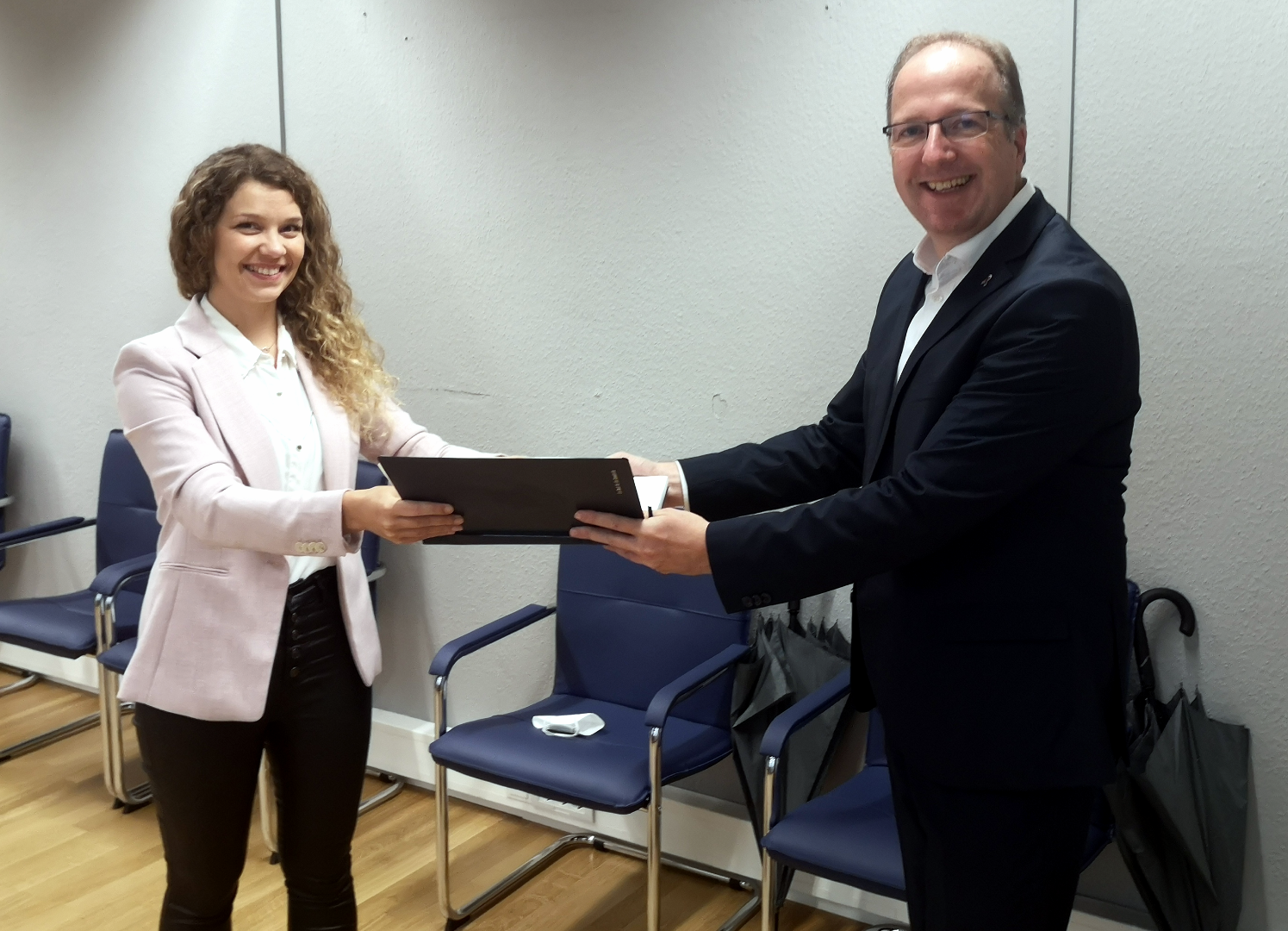Ingo Schon überreicht Scarlett Rüger das Buch für die Demokratie.