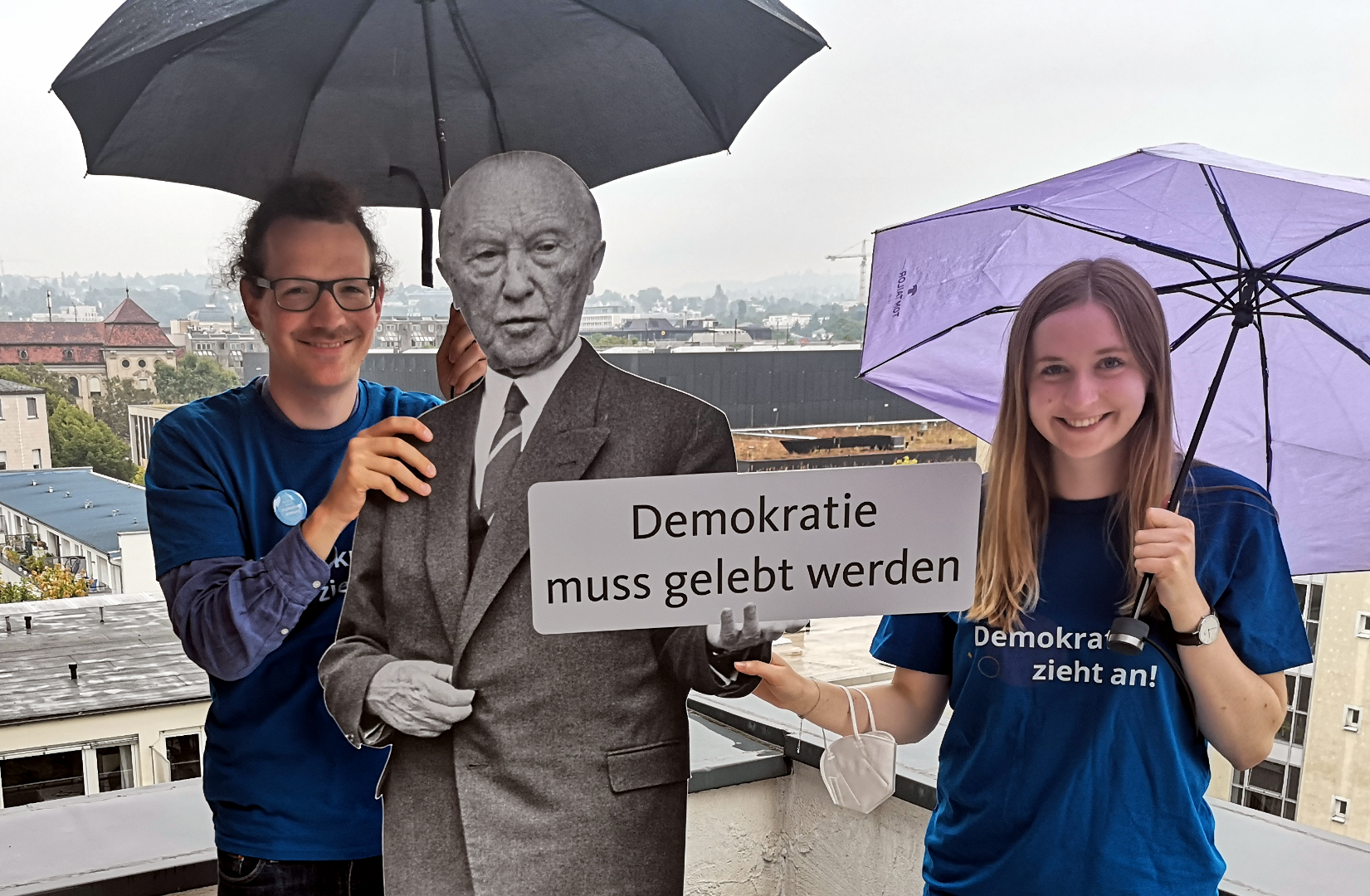 Wegen des Dauerregens konnte in diesem Jahr das Abbild Konrad Adenauers nicht mitwirken: Katarina Schäfer-Petersen, ein viertes Mal mit von der Partie, und Felix Kraft nehmen Abschied auf dem Balkon.