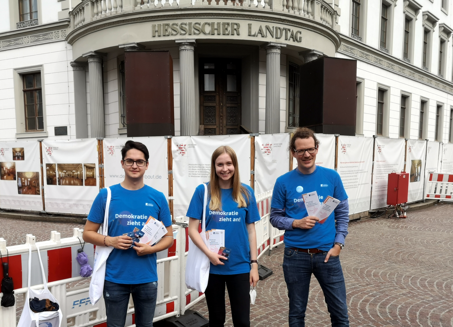 Drei vor der Baustelle: Katarina Schäfer-Petersen, Till Adams (links) und Felix Kraft am Hessischen Landtag.