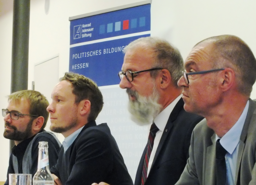 Im Mathematikum diskutierte der vor wenigen Wochen aus Berlin in die hessische Heimat zurückgekehrte Scheld mit Dr. Joachim Klose, dem Landesbeauftragten der Konrad-Adenauer-Stiftung für den Freistaat Sachsen, Dr. Manuel Becker, Politikwissenschaftler an der Universität Bonn, und 50 Teilnehmerinnen und Teilnehmern des Gießener Gesprächs der Konrad-Adenauer-Stiftung.