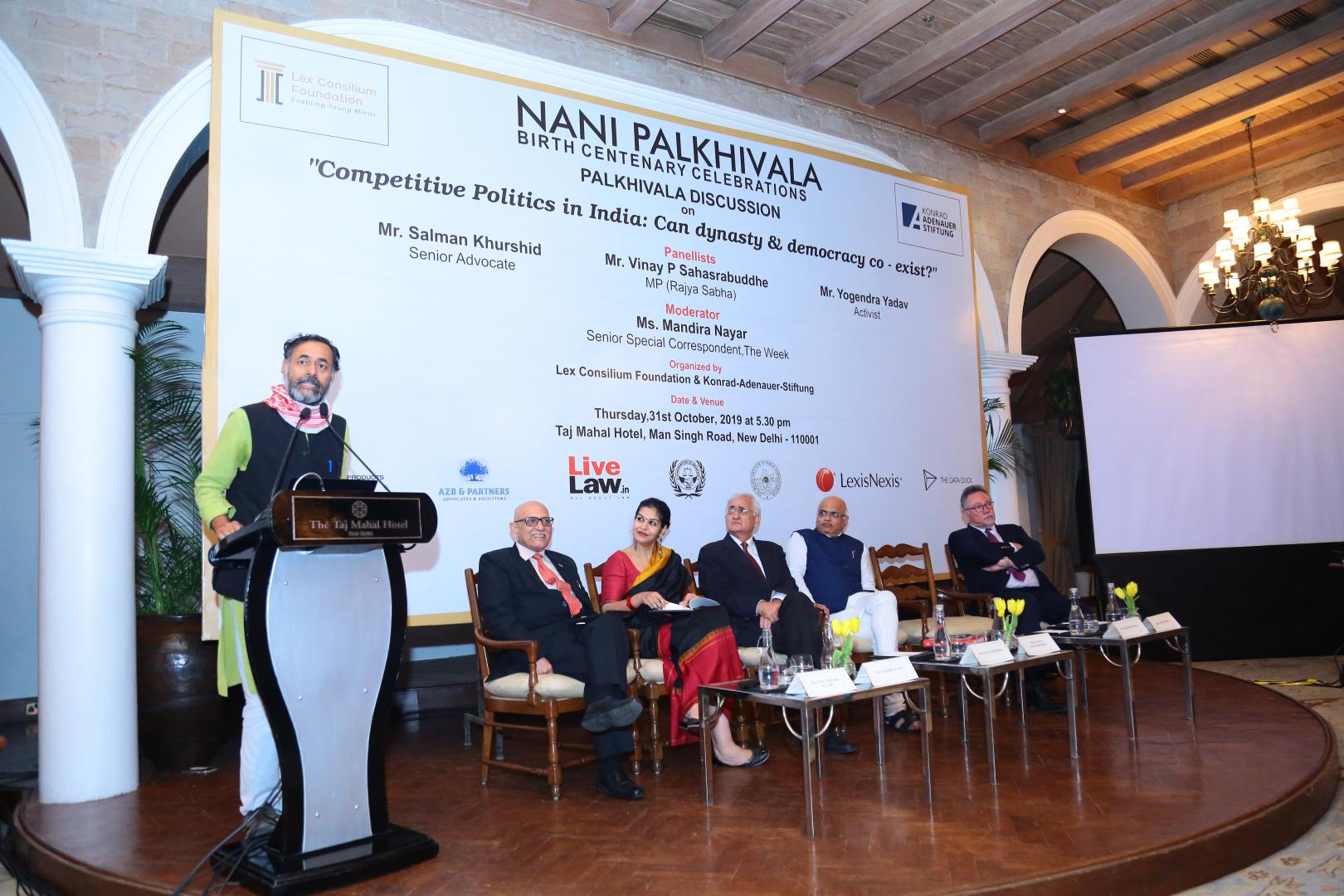 Der letzte Redner, der Aktivist und Gründer der Swaraj Party Yogendra Yadav, vertrat den klaren Standpunkt, dass Demokratie und Dynastie in keiner Weise vereinbar seien, da das grundlegende Konzept von Demokratie beinhalte, dass alle Macht vom Volke ausgehe und politische Herrschaft demnach nicht von Herkunft, Vermögen oder anderen äußerlichen Eigenschaften abhängen sollte. Er hob außerdem hervor, dass politische Dynastien keinesfalls nur ein Phänomen des Indian National Congress (INC) seien, sondern dass diese in diesem Fall nur sehr viel sichtbarer wären als bei anderen Parteien, da die politische Führung des Kongress seit vielen Jahren maßgeblich von der Nehru-Gandhi Dynastie dominiert wurde. Es existierten jedoch auch dynastische Familien innerhalb der BJP. Dies sei nach außen jedoch weniger auffällig, da es sich hierbei nicht um die politische Führung handle. Herr Yadav erklärte zudem, dass Dynastien aufgrund des erschwerten Zugangs in die Politik vorherrschend seien. Familiendynastien würden jedoch kaum Hindernissen begegnen, wenn sie eine politische Karriere anstrebten. Dies ergebe sich aus dem Kapital, das sich durch den Familiennamen ableitet, sowie aus kulturellem und finanziellem Kapital, mit dem Dynastien ausgestattet seien. Es sei deshalb wichtig, sich von Personenkult abzuwenden und eine freie, öffentliche Kultur zu etablieren, in der Personen, die an der Macht sind, hinterfragt werden können. Diese Art der Kultur sei das beste Vermächtnis für Nani Palkhivala.