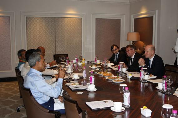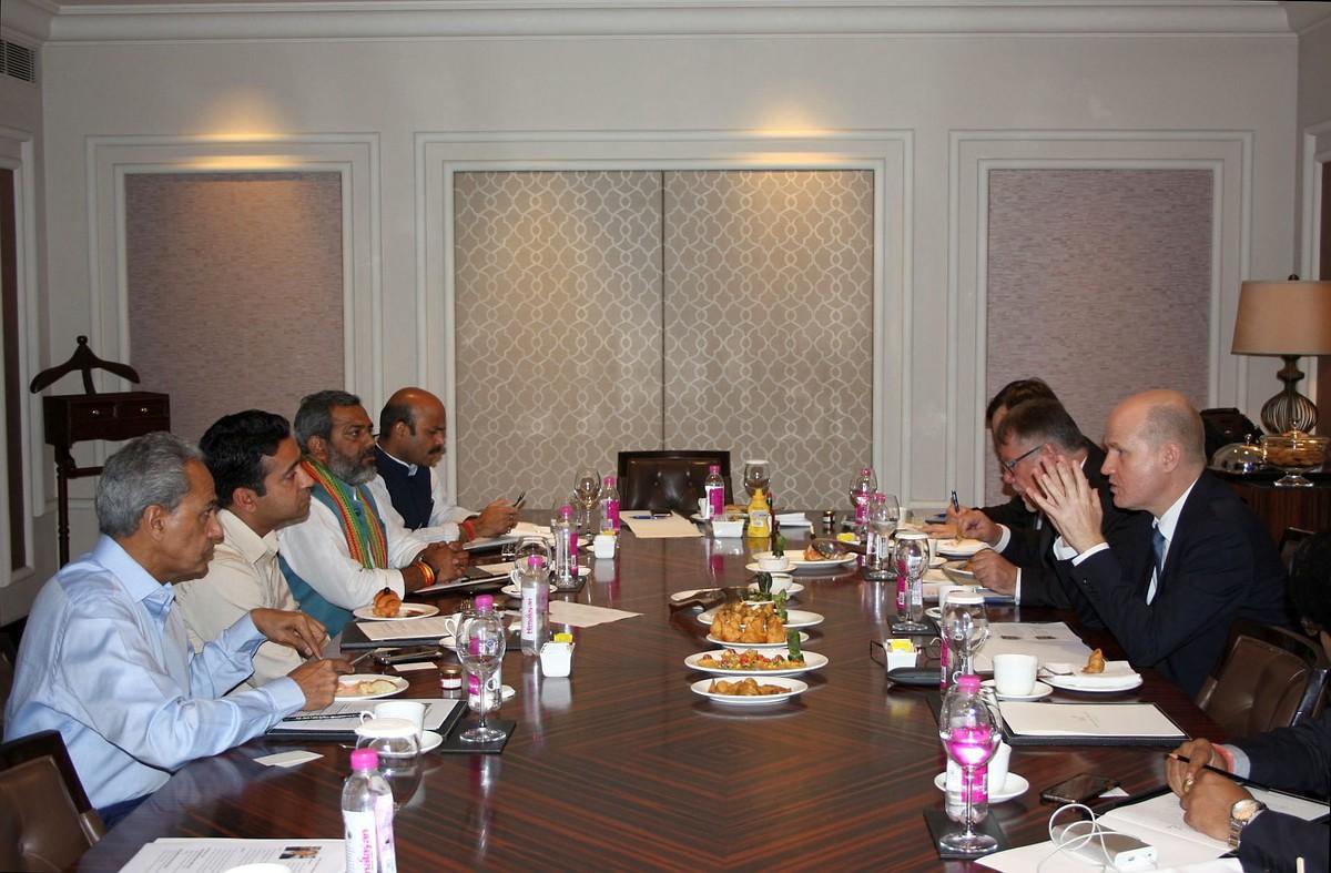 Zu Beginn des Dialogs mit den Abgeordneten hob Brinkhaus hervor, dass Indiens Bedeutung in den letzten Jahren kontinuierlich für Deutschland zugenommen hätte. Dies spiegelt sich auch in dem derzeit stattfindenden, frühzeitigen Besuch des Bundespräsidenten wider. Lange Zeit hätte sich Deutschland in Asien einseitig auf China fokussiert, diese Zeit sei jedoch vorbei. Indien ist für Deutschland mittlerweile genauso wichtig wie China, so Brinkhaus. Er wies auf die langjährigen stabilen Beziehungen zwischen beiden Ländern hin und sprach sich für einen weiteren Ausbau aus. Seiner Auffassung nach sollten neben den regelmäßigen Regierungskonsultationen auch der Austausch zwischen den Parlamentariern deutlich intensiviert werden. Letztlich ist die Gestaltung der bilateralen Beziehungen maßgeblich von einzelnen Personen abhängig, weshalb diese Beziehung durch einen regelmäßigen Austausch verfestigt und verstetigt werden müssten. Peter Rimmele, Leiter des Indien Büros der Konrad-Adenauer-Stiftung, wies darauf hin, dass die KAS gerne dazu bereit ist, diese Bemühungen zu unterstützen.