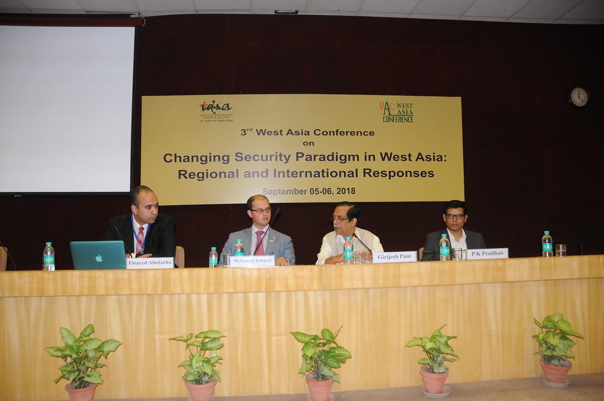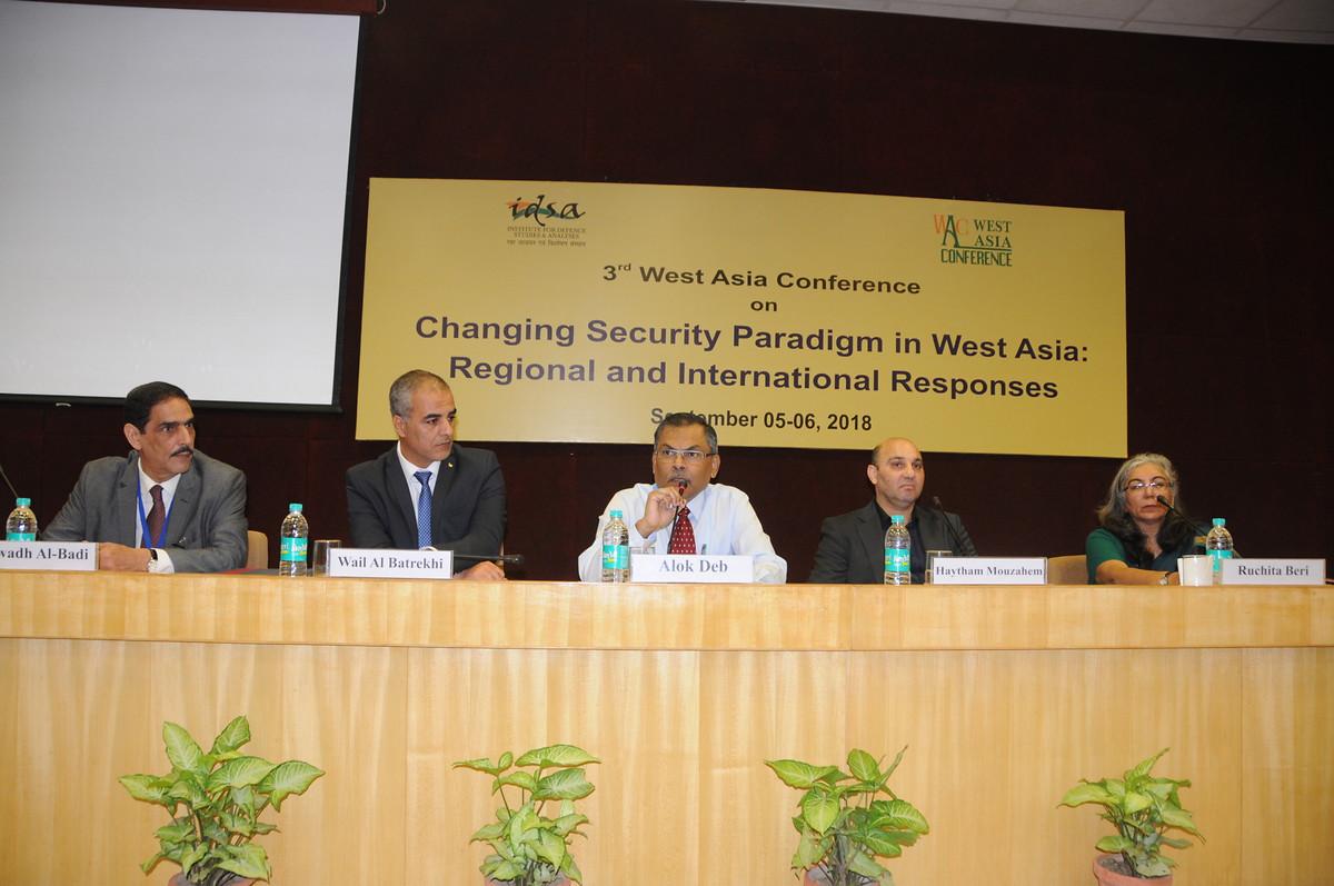 Die erste Sitzung trug den Titel "Wandelnde regionale Dynamiken in Westasien und Nordafrika" und wurde von Botschafter Swashpawan Singh, ehemaliger Sekretär des Vizepräsidenten von Indien, geleitet. Er betonte, dass Konfliktlösung einen beratenden Ansatz erfordert. Talmiz Ahmad, ehemaliger indischer Botschafter in Saudi-Arabien, Oman und den Vereinigten Arabischen Emiraten wies in seinem Vortrag darauf hin, dass Indien aufgrund seiner guten Beziehungen zu beiden Ländern die Möglichkeit habe, zwischen Iran und Saudi-Arabien zu vermitteln. Amine Gemayel, ehemaliger Präsident des Libanon, sprach über transnationalen Terrorismus. Er wiederholte, dass Indien gut positioniert sei für eine Führungsrolle in der WANA-Region. Der dritte Redner war Dr. Syed Kazem Sajjadpour, dessen Vortrag sich auf den Iran und die Region konzentrierte. Er wies auf die hohe Bedeutung des Hafens Chabahar hin, denn dieser symbolisiere die Verbindung zwischen dem Iran, Indien und Afghanistan sowie die Verbindung des indischen Subkontinents mit Zentralasien.