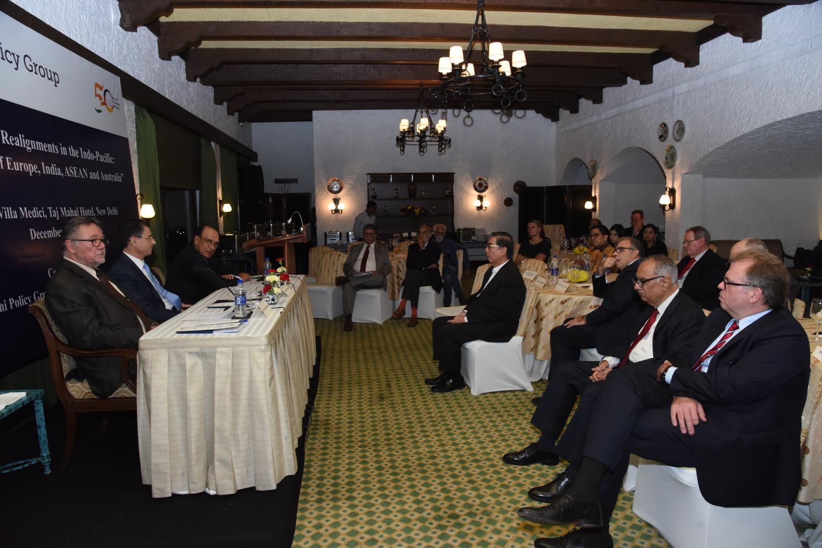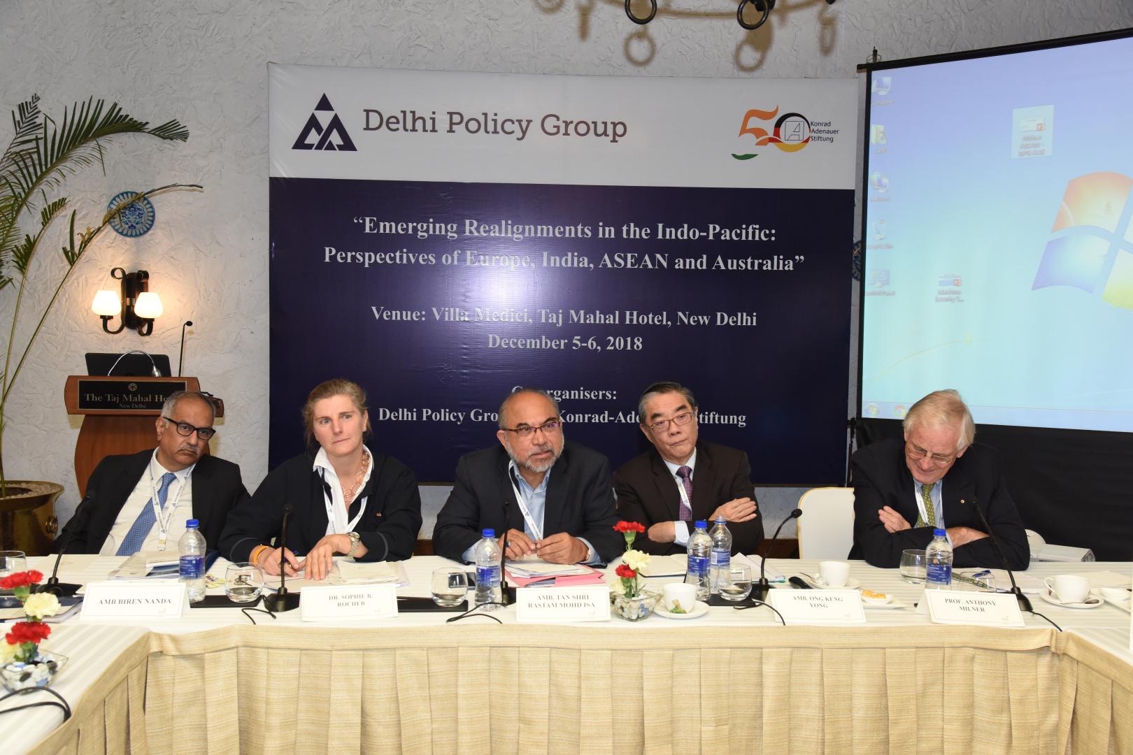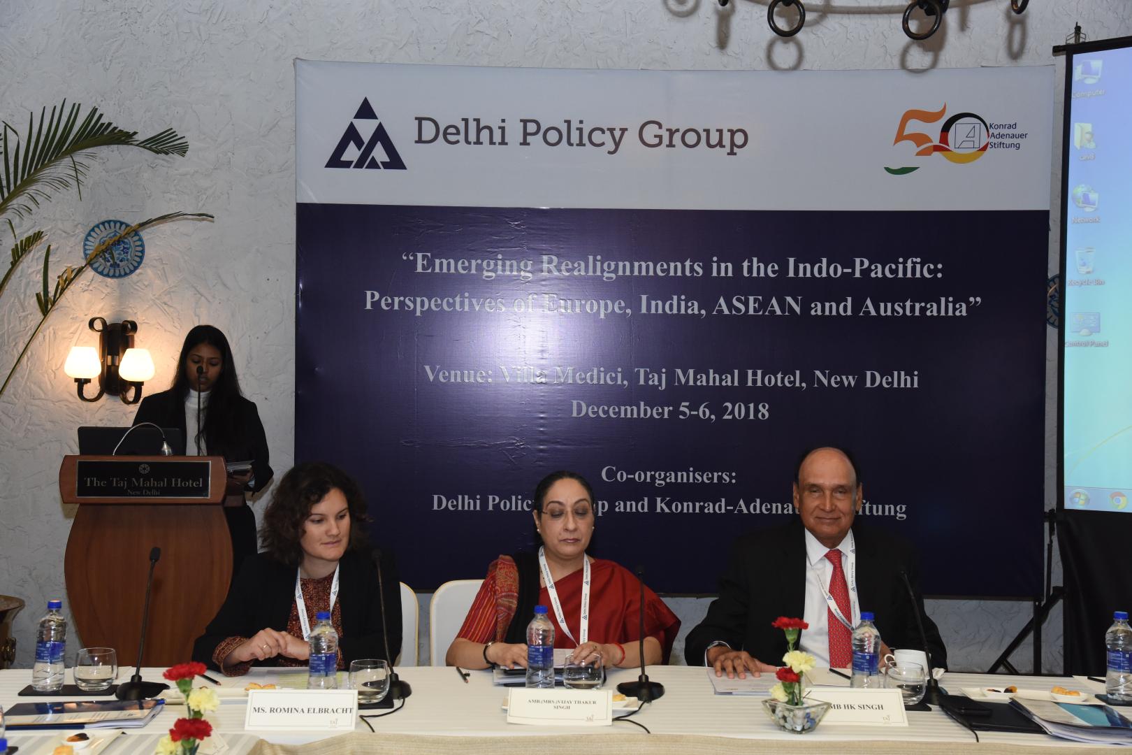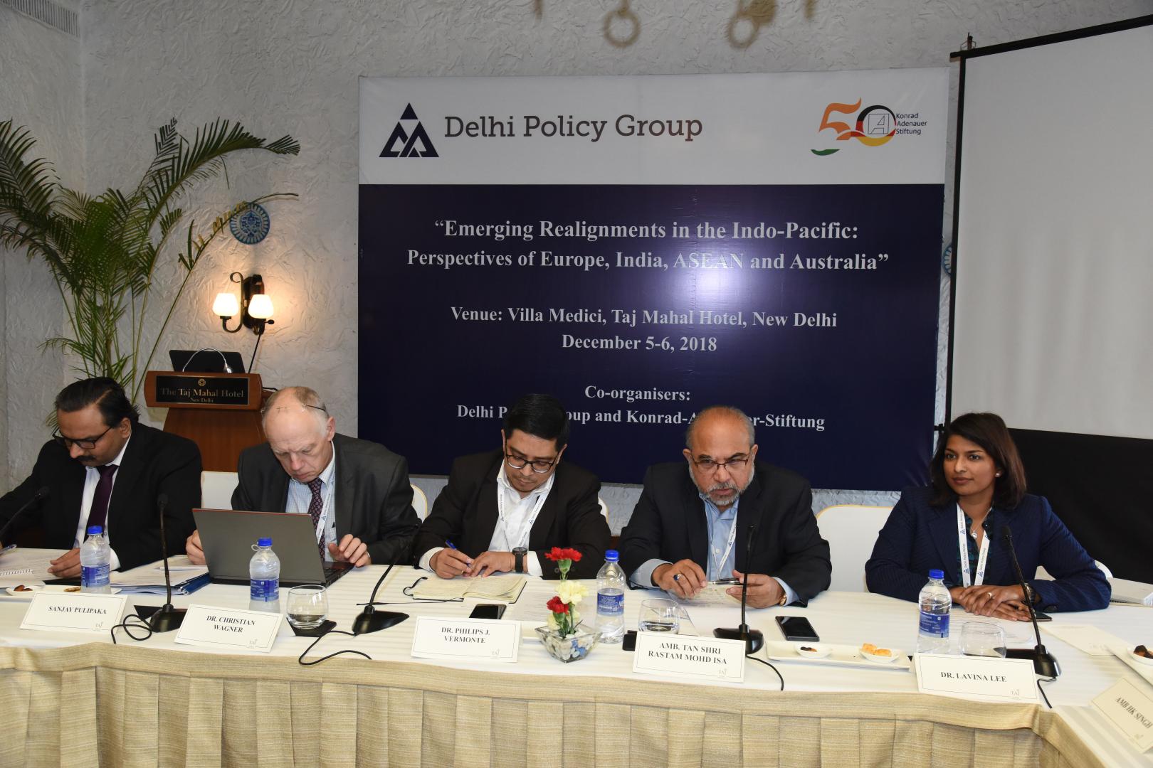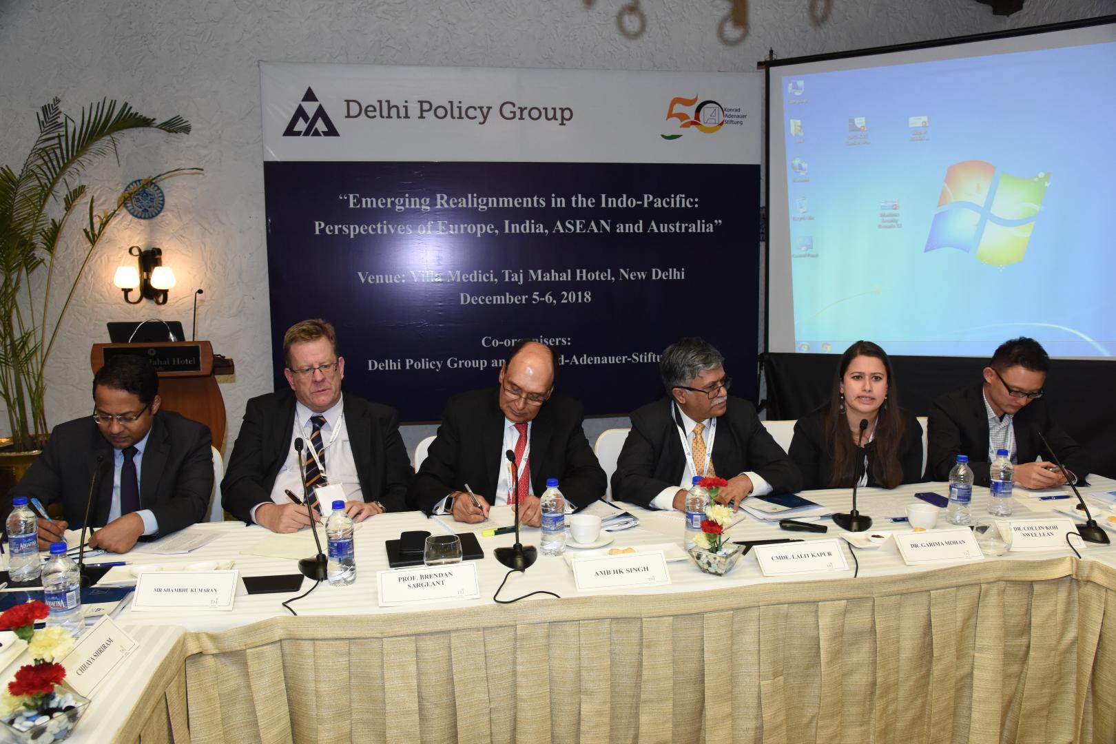 Die erste Sitzung behandelte „Veränderte Strategien in der Indo-Pazifik-Region“. Das Verhalten der USA wurde als unilateral beschrieben und der Einfluss der EU auf die Region als stärker als von vielen angenommen. In diesem Kontext könne die deutliche chinesische Dominanz nicht als selbstverständlich eingestuft werden. Eher würden Staaten wie Frankreich und Großbritannien eine entscheidende Machtbalance herstellen können. Nichtsdestotrotz müssten, um diese zu erreichen, Länder wie beispielsweise Deutschland, welches sich mit maritimen Operationen außerhalb der eigenen Grenzen eher zurückhalten würde, ein stärkeres Interesse an der Indo-Pazifik-Region entwickeln. Teilnehmer waren sich außerdem darin einig, dass die schon existierenden Institutionen, um Frieden und Sicherheit zu wahren, darin gescheitert seien, neu aufkommende Hürden zu bewältigen. Übereinstimmung gab es mit Blick auf die Zukunft, in der eine demokratische Herangehensweise mit Freihandel, einer internationalen Gesetzgebung und dem Schutz der Souveränität von Staaten einhergehen müsse. Über die Umsetzung gab es jedoch unterschiedliche Auffassungen. In Bezug auf China waren zwei unterschiedliche Sichtweisen zu erkennen, da nicht alle Seiten das gleiche Level an Besorgnis über die Auswirkungen enger wirtschaftlicher Bindung teilten: Sollte der Fokus eher auf Absicherung oder auf einer noch engeren Zusammenarbeit liegen?
