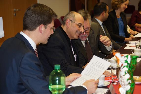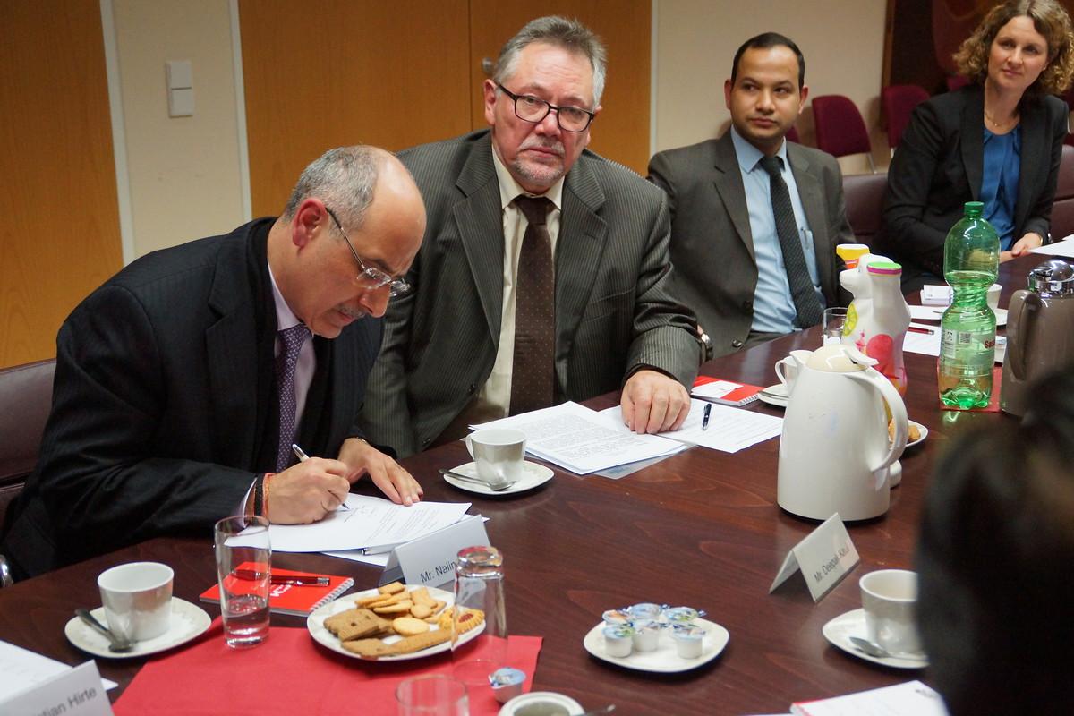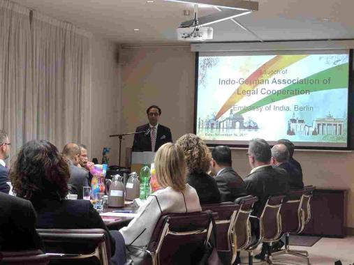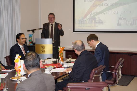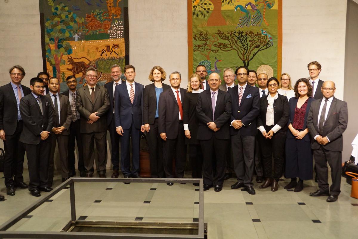 Die Initiatoren Christian Hirte, MdB, und Nalin S. Kohli, ein bedeutender Anwalt sowie nationaler Sprecher der Bharatiya Janata Partei (BJP), wiesen in ihren einführenden Worten auf die wachsende Bedeutung Indiens und die hohe Relevanz eines Austauschs über rechtliche Fragen hin. Gerade im Hinblick auf die wachsende wirtschaftliche Zusammenarbeit beider Länder sei ein regelmäßiger Austausch zu rechtlichen Entwicklungen unerlässlich. Sie betonten, dass mit der Gründung des Vereins nun der Dialog über rechtliche Fragen verstetigt werden kann und Deutschland und Indien von diesem Dialog künftig enorm profitieren würden. Peter Rimmele, Leiter des Auslandsbüros Indiens, rekapitulierte in seiner Rede die Entstehungsgeschichte des Vereins und erinnerte an die besondere Rolle seines, leider mittlerweile von uns gegangenen, Vorgängers Lars-Peter Schmidt bei der Initiierung des rechtlichen Dialogs und die Vernetzung der Gründungsinitiatoren. Abhishek Singh, Deputy Chief of Mission der indischen Botschaft, betonte, dass die deutsch-indische strategische Partnerschaft durch den Verein weiter gestärkt würde und regte zu einem weiteren Ausbau der deutsch-indischen Kooperation an.