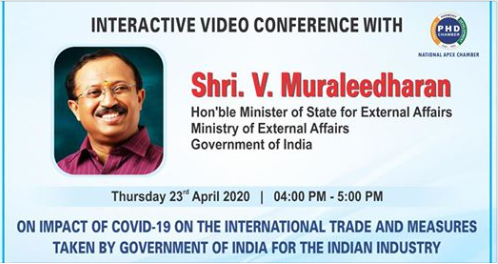 Zusammen mit der PHD Handelskammer, Neu-Delhi, organisierte die Konrad-Adenauer-Stiftung am 23. April 2020 einen virtuellen Dialog über die "Auswirkungen von Covid-19 auf den internationalen Handel und die industriepolitischen Maßnahmen der indischen Regierung". Es sprach der indische Staatsminister für Auswärtige Angelegenheiten V. Muraleedharan.