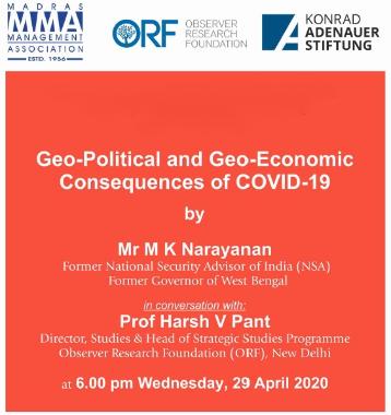 Die Konrad-Adenauer-Stiftung organisierte zusammen mit der Madras Management Association, Chennai, am 29. April 2020 einen virtuellen Dialog über "Geopolitische und geoökonomische Konsequenzen von COVID-19" mit Herrn M. K. Narayanan, ehemaliger Nationaler Sicherheitsberater Indiens (NSA) und ehemaliger Gouverneur von Westbengal.