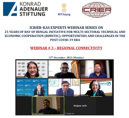 As BIMSTEC marks its 25th anniversary in 2022, ICRIER and the India office of Konrad- Adenauer-Stiftung (KAS), in collaboration with the NITI Aayog, have initiated a webinar series titled 25 Years of BIMSTEC: Opportunities and Challenges in the post-COVID 19 Era. The objective of the dialogue series is to assess the achievements, identify areas where BIMSTEC has under- performed and consider the way forward with a focus on three interconnected themes – trade and investment, transport connectivity and trade facilitation and energy cooperation. The third webinar in the series, organized on 12th December 2022, focussed on regional connectivity and the discussion revolved around the following key themes: – Strategy for financing and implementing the Master Plan. – Fast-tracking of the governance framework through the CSA and MVA. – Trade facilitation measures for seamless connectivity across borders. – Aligning of national plans with the regional initiative.