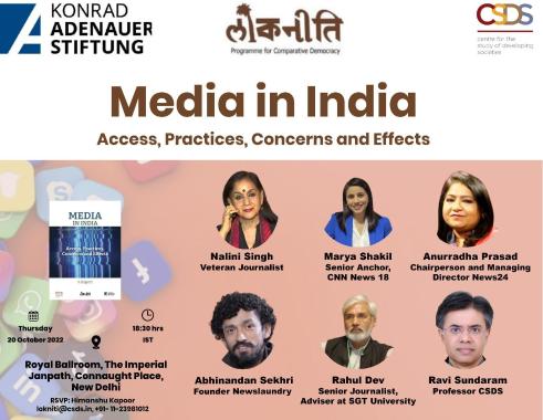 Media In India: Access, Practices, Concerns and Effects is a collaborative study of Lokniti, a programme of Centre for the Study of Developing Societies and Konrad Adenauer Stiftung (KAS). The report is based on a nationwide survey conducted among over 7,400 citizens earlier this year. The study is comprehensive in nature covering media in all its forms – traditional, new and evolving. It looked at people’s access to different kinds of media, their usage and consumption patterns, and their concerns and attitudes regarding critical issues such as news media coverage, media freedom, media bias, fake news, surveillance, privacy, free expression, censorship, internet shutdowns etc. Lokniti-CSDS and the India Office of Konrad Adenauer Stiftung, organised an event to release the report and conduct a Panel Discussion, on the 20th October 2022, at The Imperial, Janpath, Connaught Place, Delhi-110001, between 1830- 2030 (IST).