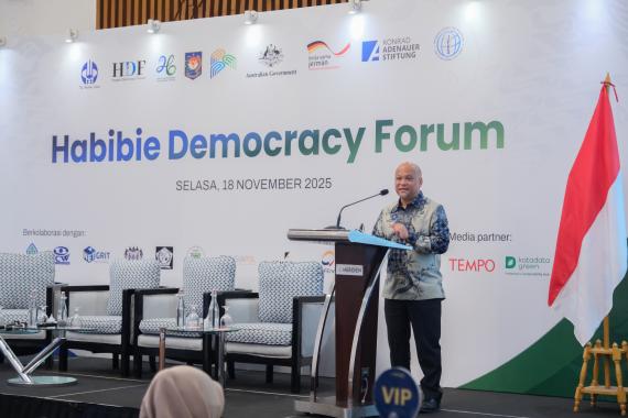 Zuvor hatte Dr. Ilham Habibie, Co-Founder von The Habibie Center und Sohn des dritten Präsidenten der Republik Indonesien, B. J. Habibie, in seinen einleitenden Worten an dessen zentrales Anliegen erinnert: Während seiner Präsidentschaft habe es B. J. Habibie als entscheidend erachtet, Indonesien konsequent auf den Weg der Demokratie zu führen. In der Übergangsphase seiner Amtszeit habe er unter anderem die Pressefreiheit eingeführt, das Recht auf die Gründung politischer Parteien ermöglicht und damit die Voraussetzungen für die erste demokratisch durchgeführte Wahl des Landes geschaffen.