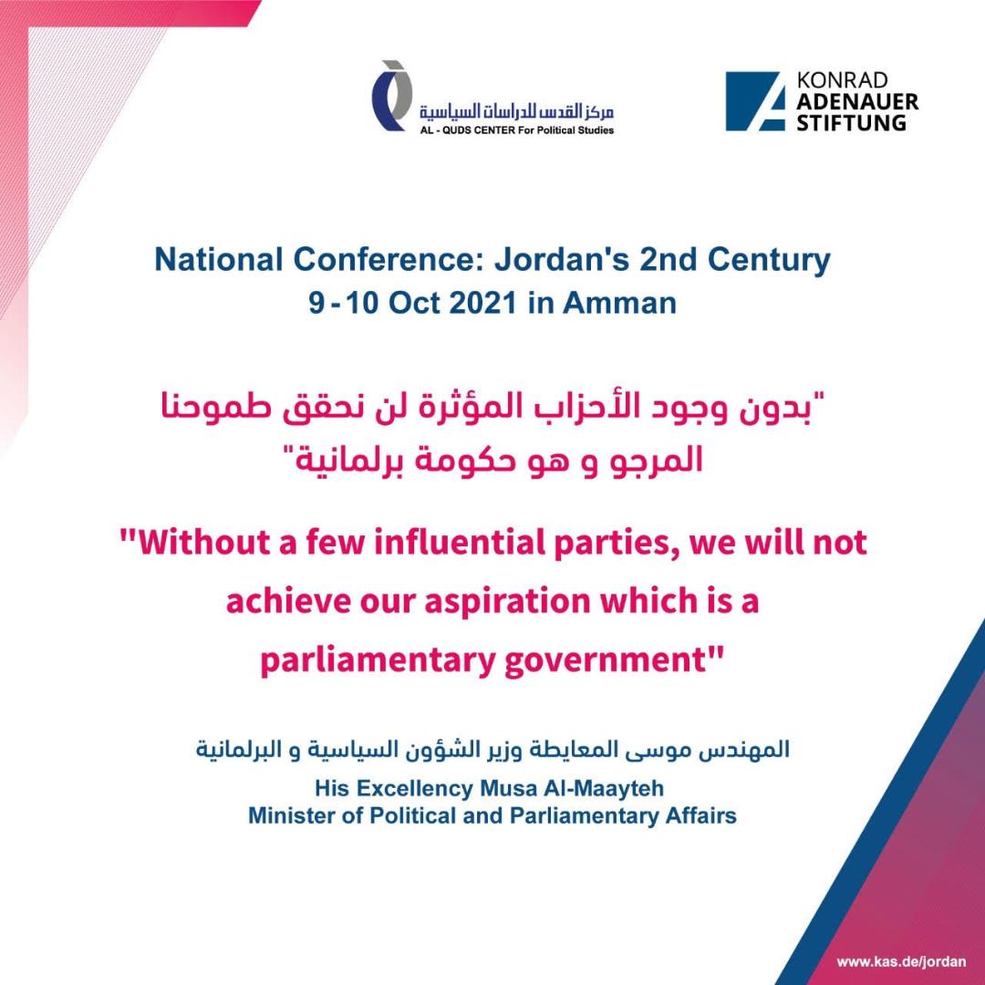 The theme of the two days national roundtable discussion held on October 9th and 10th 2021 in Amman revolved around the newly published report by the Royal Committee to Modernize the Political System. Given the latest pressing national challenges and regional turmoil, several speakers reiterated that reforms in Jordan cannot be perceived as a luxury anymore but rather a prerequisite for democracy and development, the initiative by King Abdullah II aims at putting forward political reforms. The outcomes of the Royal Committee mainly propose newly drafted election and political parties’ laws, constitutional amendments connected to these two laws and provide recommendations on developing legislation regulating local administration.