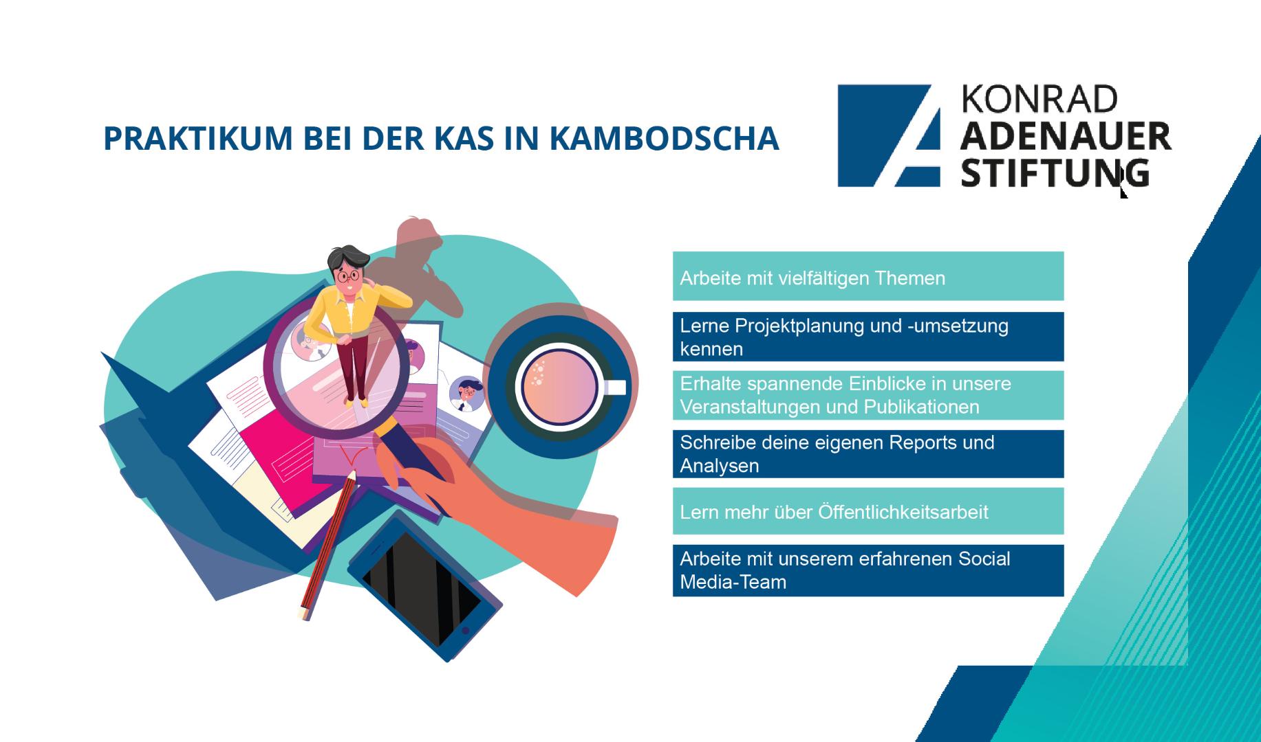 Das Auslandsbüro Kambodscha der Konrad-Adenauer-Stiftung bietet interessierten Studierenden die Möglichkeit, während eines Praktikums die internationale Arbeit der Konrad-Adenauer-Stiftung vor Ort kennen zu lernen und in unseren Projekten mitzuarbeiten.