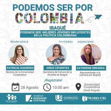 Am Samstag, dem 28. August fand die zweite Veranstaltung unserer Tournee durch Kolumbien zur Vorstellung der Publikation “Podemos Ser” in der Universidad Cooperativa in Ibagué statt. Als Referenten nahmen teil, die Abgeordnete der Repräsentantenkammer, Katherine Miranda und die Kultursekretärin von Ibagué, Greis Cifuentes.