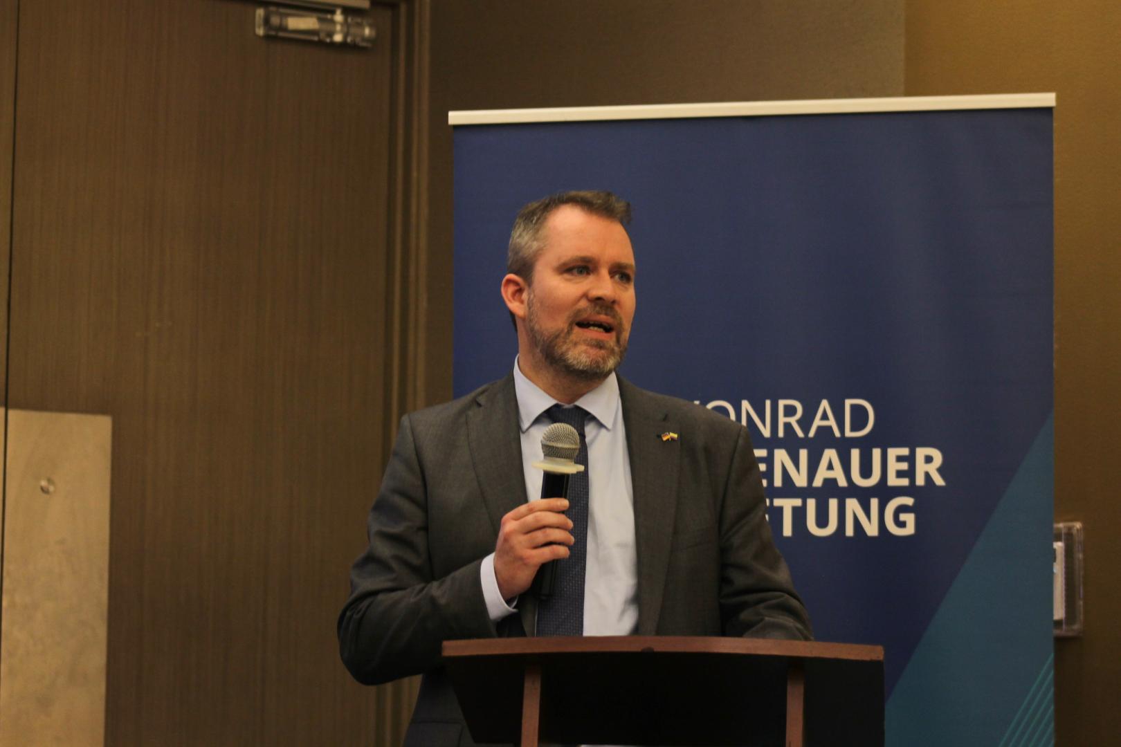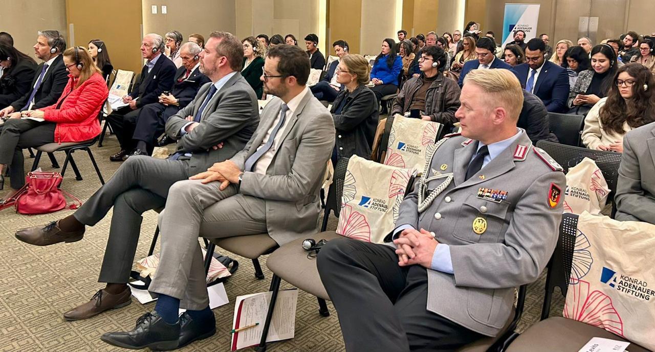 Der stellvertretende Botschafter der Bundesrepublik Deutschland in Kolumbien, Simón Herchen, erklärte, wie solche Diskussionsräume und der Ideenkonstruktion ein Forum für die Verteidigung der demokratischen Werte in einem zunehmend feindseligen geopolitischen Umfeld bieten.