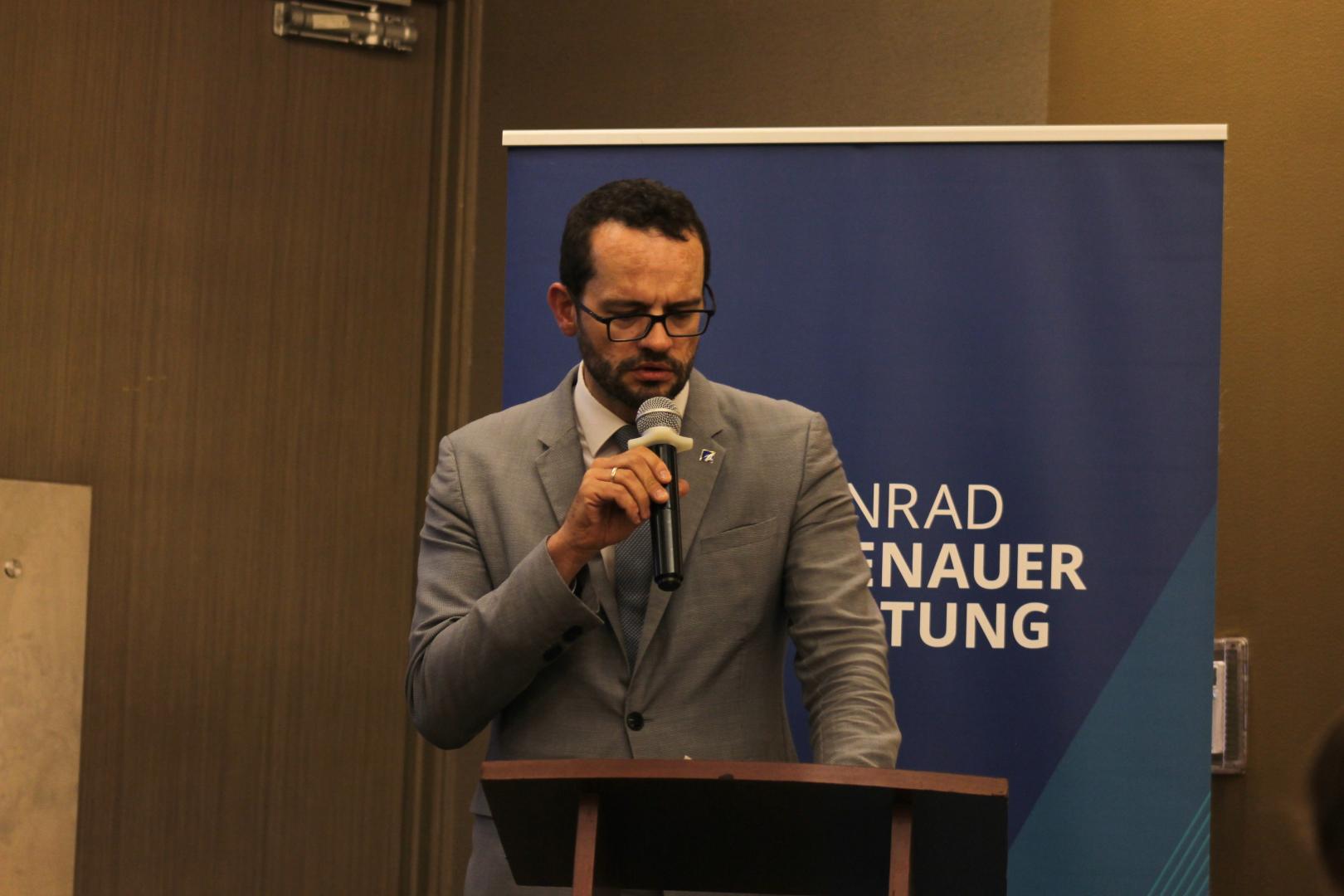 Die Veranstaltung begann mit den Grußworten des Direktors der Konrad-Adenauer-Stiftung KAS Kolumbien, Hartmut Rank; dabei stellte er das Ende des Zweiten Weltkriegs als Beginn einer neuen Ära dar und betonte, dass die Schaffung demokratischer Institutionen der Notwendigkeit einer neuen Weltordnung entsprach, die auf der Würde des Menschen, dem Rechtsstaat, der politischen Freiheit und der internationalen Zusammenarbeit basierte. Trotzdem zeigte er sich besorgt darüber, dass die Demokratie ein schwaches Netzwerk darstelle, das immer komplexeren Bedrohungen ausgesetzt sei; daher seien die Arbeit der einzelnen Staaten, der internationalen Organisationen, der Vertreter der Zivilgesellschaft bei der Verteidigung und dem Schutz der Demokratie besonders wichtig.