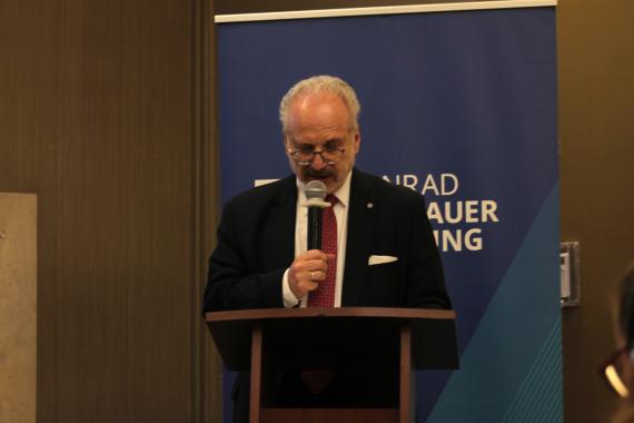 Im Anschluss sprach der ehemalige Präsident von Lettland, Dr. Egils Levitz, über die Auswirkungen des Endes des Zweiten Weltkriegs auf die globalen Institutionen; dabei betonte er, dass der Frieden auf Gerechtigkeit basieren müsse und dass internationale Organisationen wie der Sicherheitsrat oder der Internationale Strafgerichtshof klare Parameter darüber geschaffen haben, was legal ist und was nicht. Trotzdem zeigte er sich besorgt über die weltweite Krise demokratischer Werte und des Rechtsstaats und darüber, dass die Akteure, die bereit sind, die Regeln zu befolgen, immer weniger werden; gleichzeitig betonte er die Notwendigkeit die aktuellen Institutionen zu überdenken und anzupassen, um die Demokratie zu verteidigen.