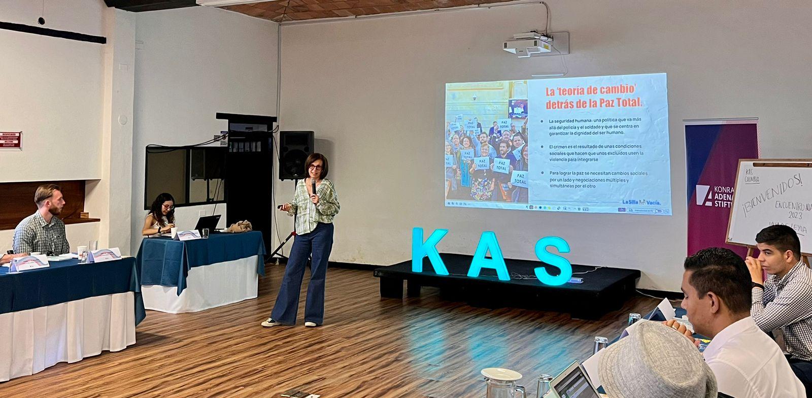 Die Direktorin der Silla Vacía, Juanita León, referierte anschließend über das Regierungsprojekt des „Totalen Friedens“. Sie erklärte, dass damit strukturelle Gründe für die Gewalt im Land angegangen werden solle, wie zum Beispiel soziale Ungerechtigkeit, Ungleichheit oder Armut. Außerdem sollten Abkommen mit illegalen bewaffneten Gruppierungen getroffen werden, die einen gewissen politischen Hintergrund haben, darunter das “Nationale Befreiungsheer” ELN, der „Estado Mayor Central“ und die Gruppe „Segunda Marquetalia“, während andere illegale Gruppen ohne politischen Hintergrund mit anderen organisatorischen Dynamiken sich einem neuen Gesetz unterwerfen sollten. Dabei gab Frau León einen Überblick über Zusammensetzung und Motive der wichtigsten bewaffneten Gruppierungen und ihre Präsenz in den Regionen des Landes.